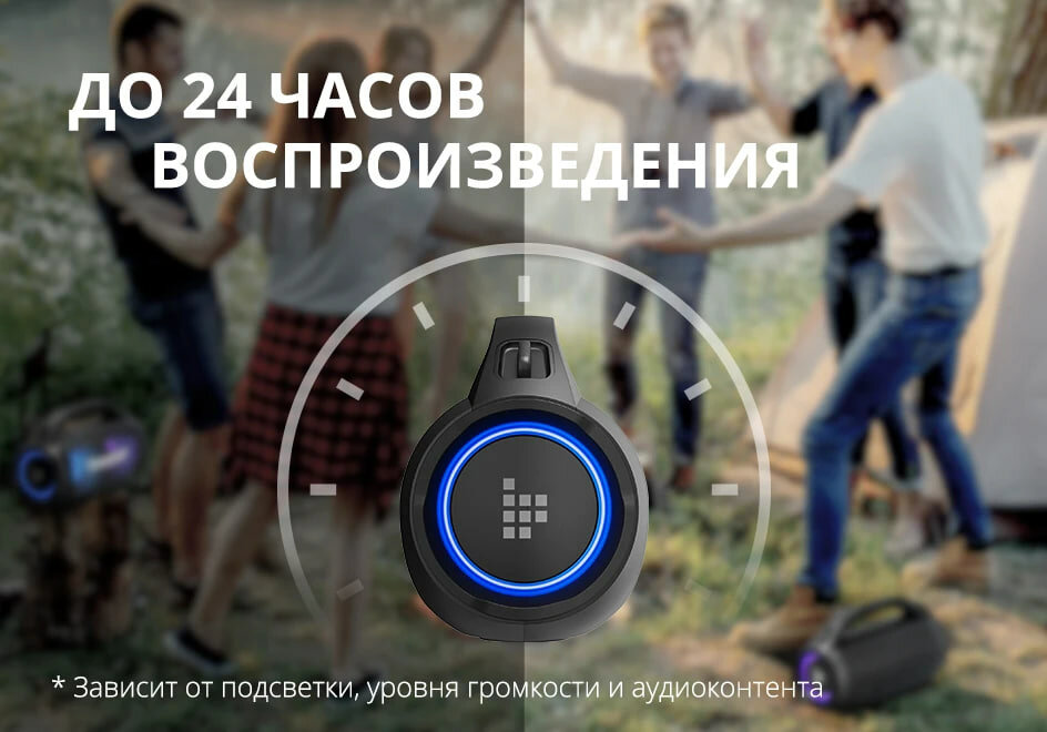 | Особенности | FM-радио, NFC, вибродинамик, влагозащищенный корпус, встроенный микрофон (функция HandsFree), дисплей, карабин, караоке, поддержка microSD, режим Power Bank, ремешок, ручка, световые эффекты |