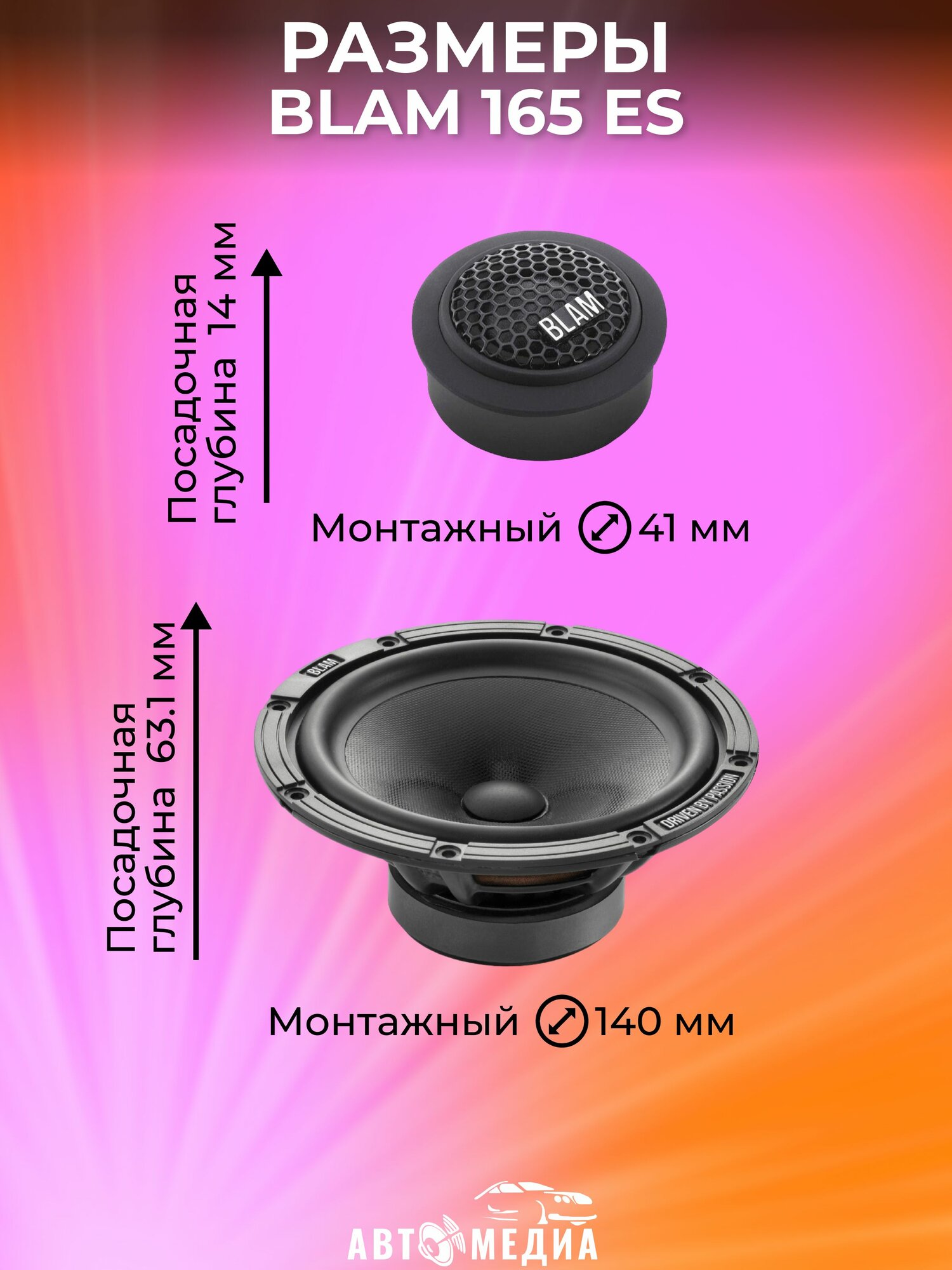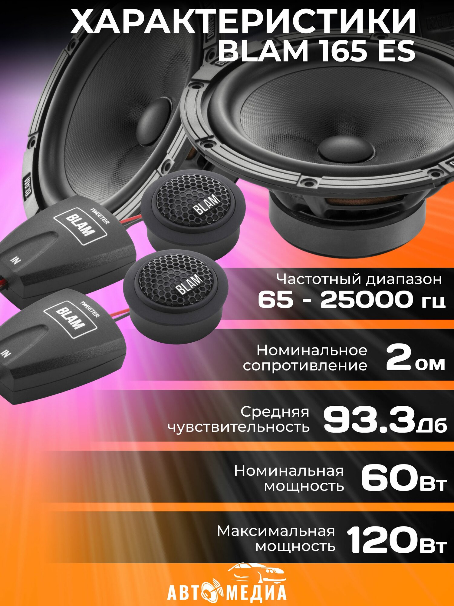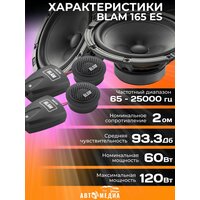 BLAM 165 ES - мы все знаем, что качество динамика имеет одно из решающих значений для звука. Если штатная аудиосистема вас не удовлетворяет, замените динамики на BLAM EXPRESS, чтобы ощутить заметное улучшение и перейти на новый уровень. Эти системы были специально разработаны, чтобы вы могли услышать «французский звук» без каких-либо других модификаций автомобиля. Лучший вариант для замены штатной акустики. Если штатная аудиосистема вас не удовлетворяет, замените динамики на BLAM EXPRESS, чтобы ощутить заметное улучшение и перейти на новый уровень. Акустика спроектирована с учётом всех особенностей штатных аудиосистем. Комплектация и технические характеристики Blam 165 ES: Тип: 2-компонентная акустика Размер: 16,5 см Кроссовер: 6 dB/oct НЧ-динамик 165 ES: Мощность максимальная, Вт: 120 Мощность RMS, Вт: 60 Частотный диапазон, Гц: 65 – 8000 Сопротивление, Ом: 2 Чувствительность, дБ: 93,3 Материал диффузора: бумага Материал магнита: феррит Монтажная глубина, мм: 63,1 Монтажный диаметр, мм: 140 ВЧ-динамик ET 20: Мощность максимальная, Вт: 100 Мощность RMS, Вт: 10 Частотный диапазон, Гц: 2500 – 31000 Сопротивление, Ом: 3 Чувствительность, дБ: 90 Материал магнита: неодим Монтажная глубина, мм: 14 Монтажный диаметр, мм: 41