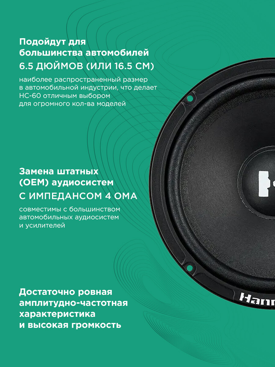 Hannibal HC-60 — компонентная акустическая система размером 6,5 дюймов, созданная для обеспечения качественного звучания в автомобиле. Диапазон частот от 90 до 20 000 Гц позволяет детально воспроизводить как низкие, так и высокие частоты. Система работает с мощностью 70 Вт RMS и выдерживает пиковую нагрузку до 140 Вт. Благодаря чувствительности 90,2 дБ обеспечивается высокая громкость без искажений. Сопротивление в 4 Ом делает HC-60 совместимой с большинством автомобильных усилителей. Монтажная глубина 61,3 мм и отверстие диаметром 149,7 мм облегчают установку, а общий вес с упаковкой составляет 1,789 кг. Отличный выбор для тех, кто ценит сбалансированное звучание и надежность.