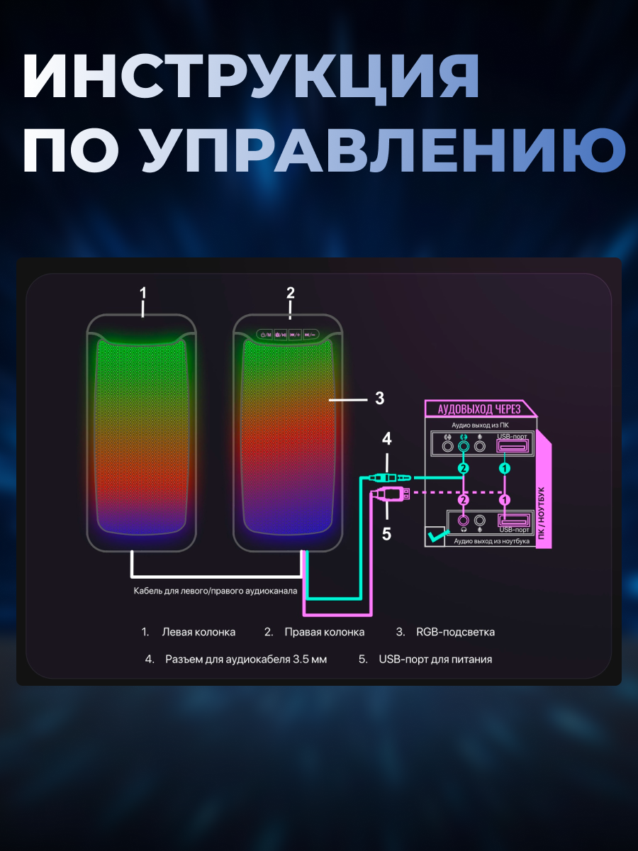 Мощная домашняя акустическая система для телевизора и ноутбука с подсветкой создаёт насыщенный стереоэффект и обеспечивает глубокие басы благодаря встроенному сабвуферу для дома. Двухполосные динамики формируют детальное звучание высоких частот, идеально передавая музыкальные нюансы и атмосферу. Колонки для компьютера и ПК легко подключаются как проводным способом, так и через Bluetooth, превращая устройство в полноценный музыкальный центр. Это универсальная акустическая система для дома, подходящая для телевизора, ноутбука или смартфона. Она обеспечивает стабильное соединение без помех и чистое, музыкальное звучание в любом помещении. Современный дизайн с эффектной RGB-подсветкой делает акустическую систему стильным элементом интерьера. Регуляторы громкости и режимов расположены на передней панели, обеспечивая удобное управление. Корпус колонок не только придаёт эстетичный вид, но и улучшает акустику, уменьшая вибрации и искажения. Колонки для компьютера с сабвуфером идеально подойдут для игр, фильмов и прослушивания любимых треков. Они создают атмосферу настоящего присутствия, обеспечивая мощное и чистое звучание. Эта акустика Bluetooth станет отличным выбором для тех, кто ценит качество, функциональность и стиль. Колонка музыкальная, мощная акустика для телевизора и ПК — идеальное решение для дома, офиса или вечеринки.