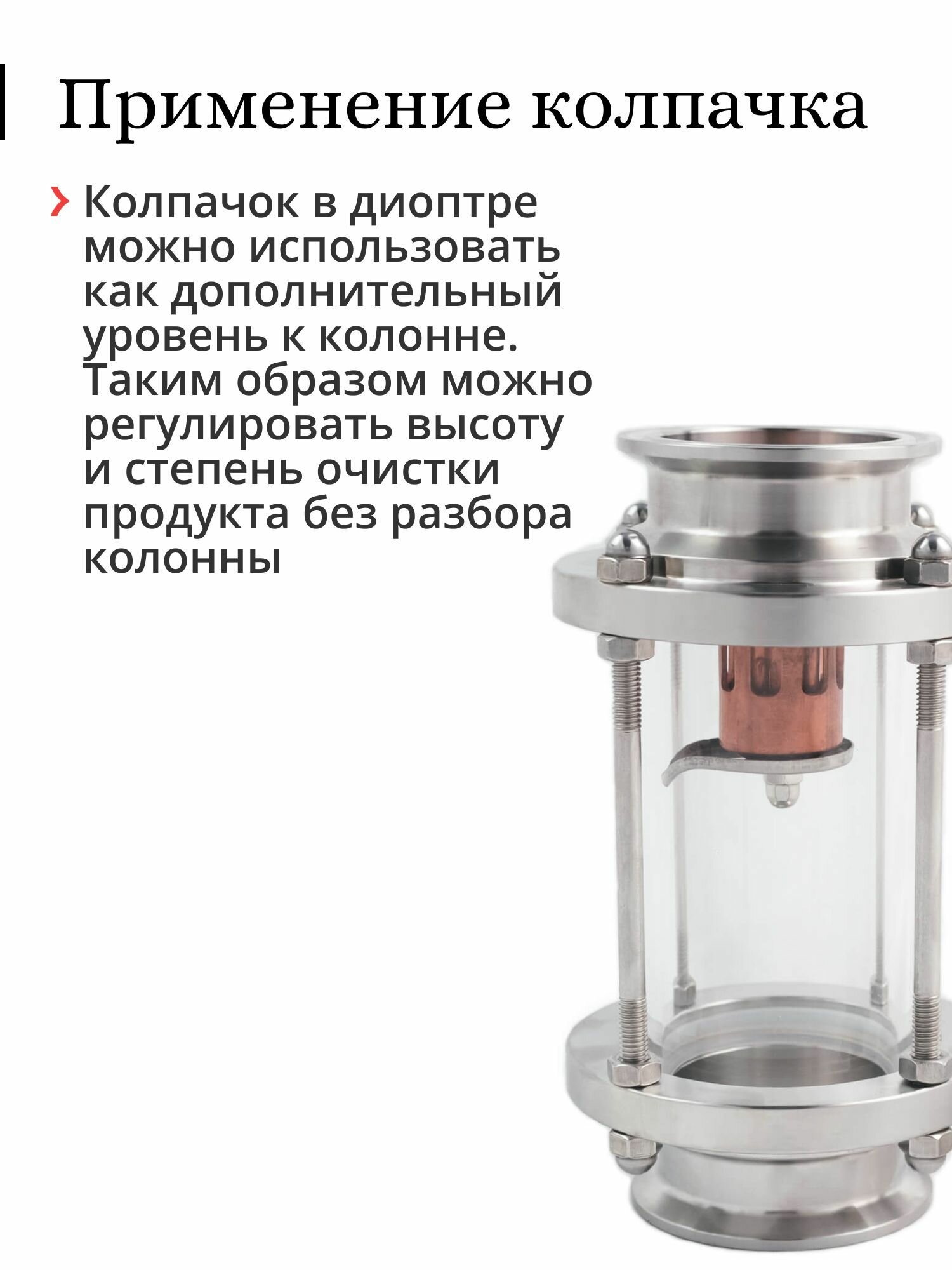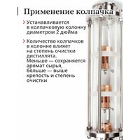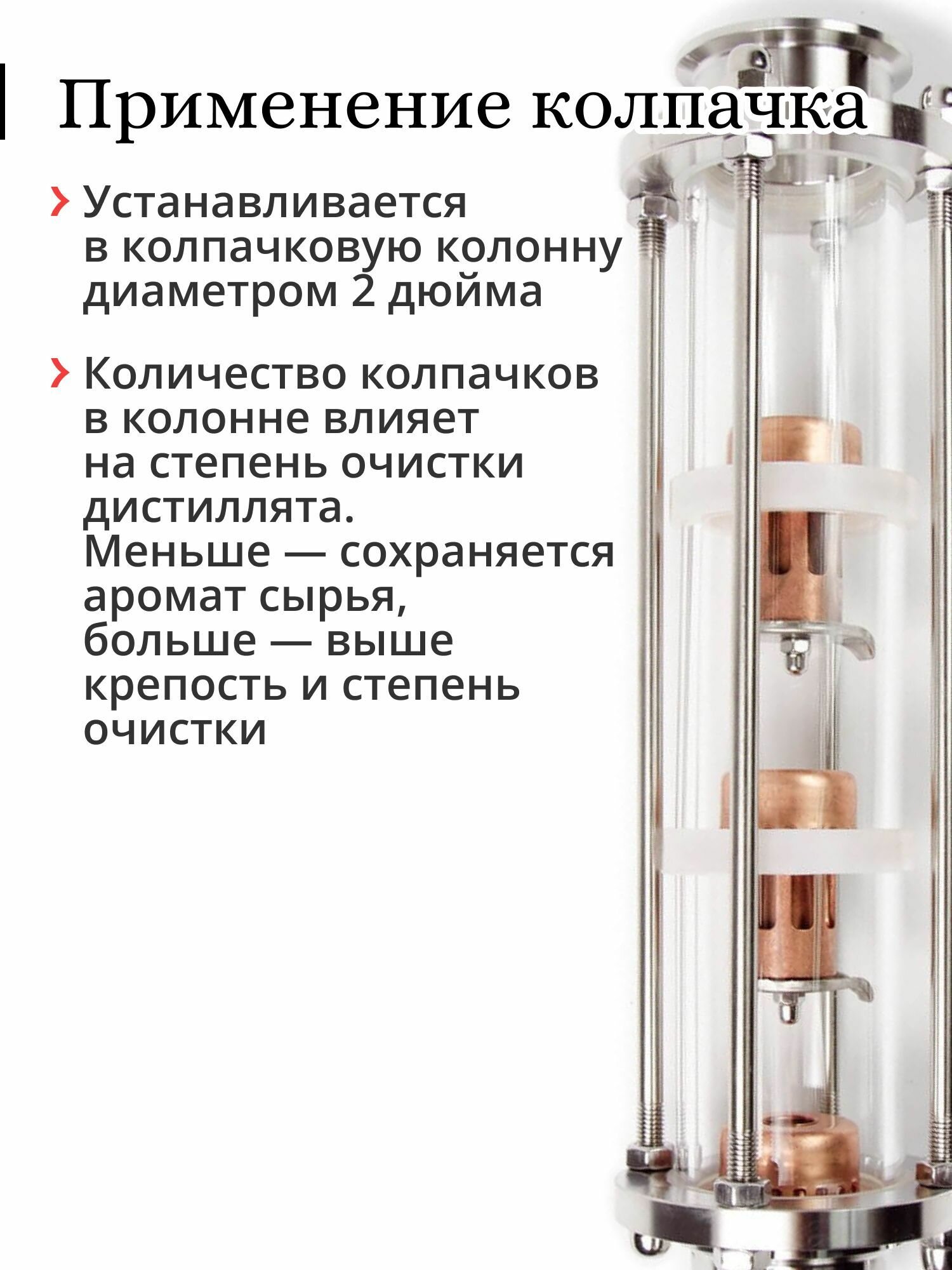 Благодаря колпачкам пары спирта более точно разделяются по фракциям, отлично сохраняя аромат сырья. Медный колпачок рекомендуется для зерновых и фруктовых браг, с колпачками из нержавейки — для сахарных.