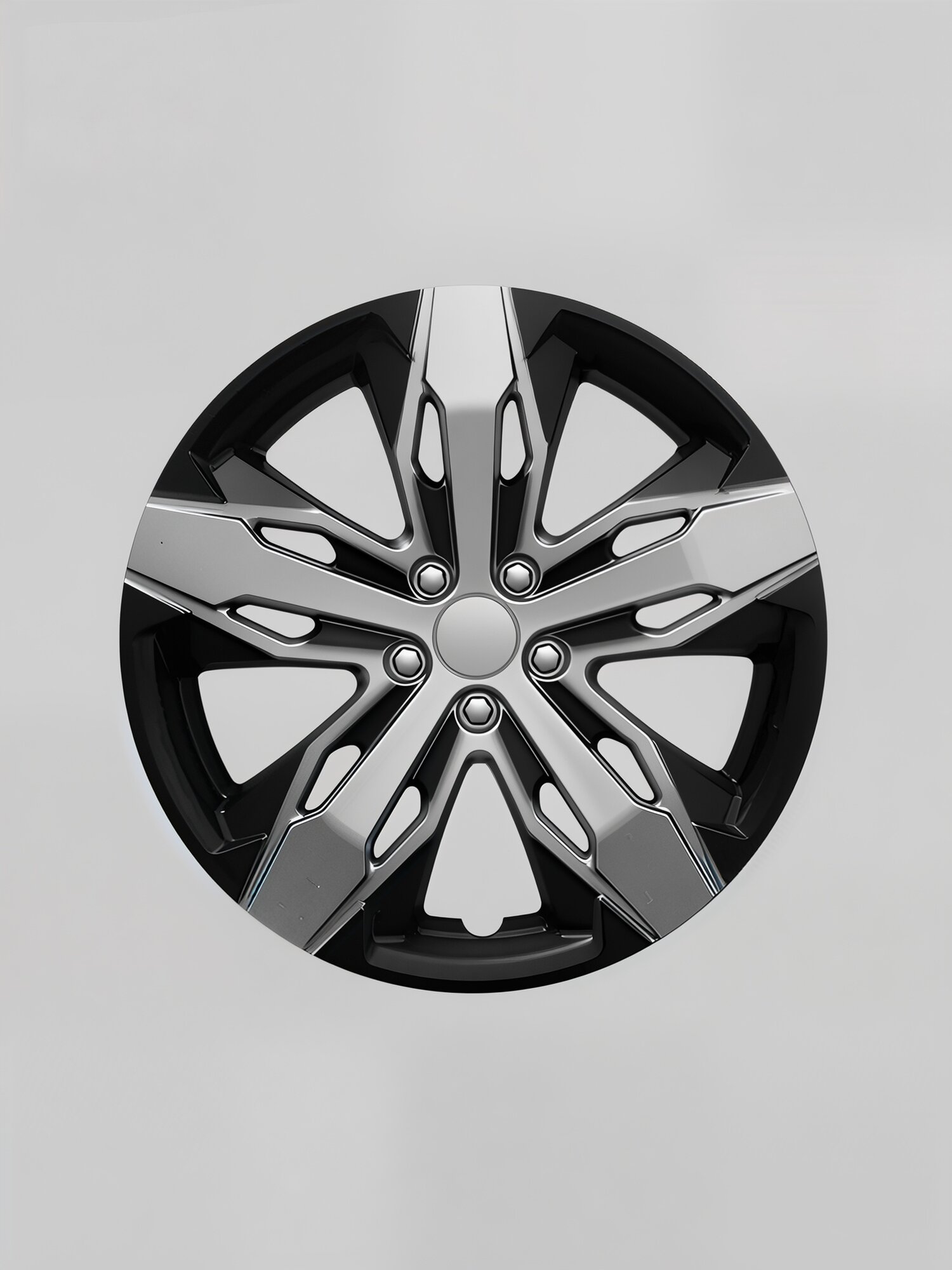 Благодаря использованию трафарета №3 при изготовлении, каждый колпак имеет уникальный и привлекательный дизайн. Серебристо-черный цвет изделия придает автомобилю современный и стильный вид.