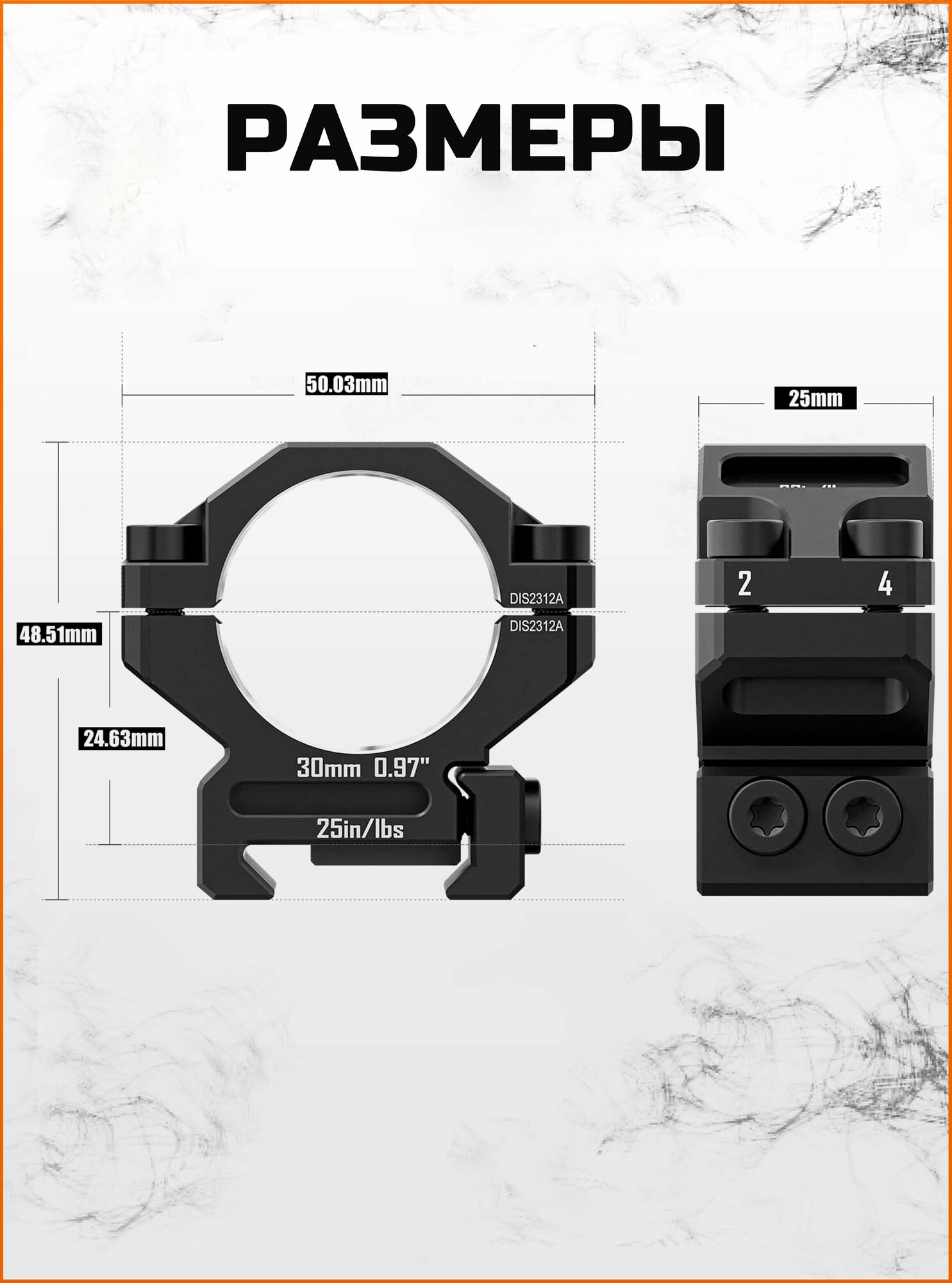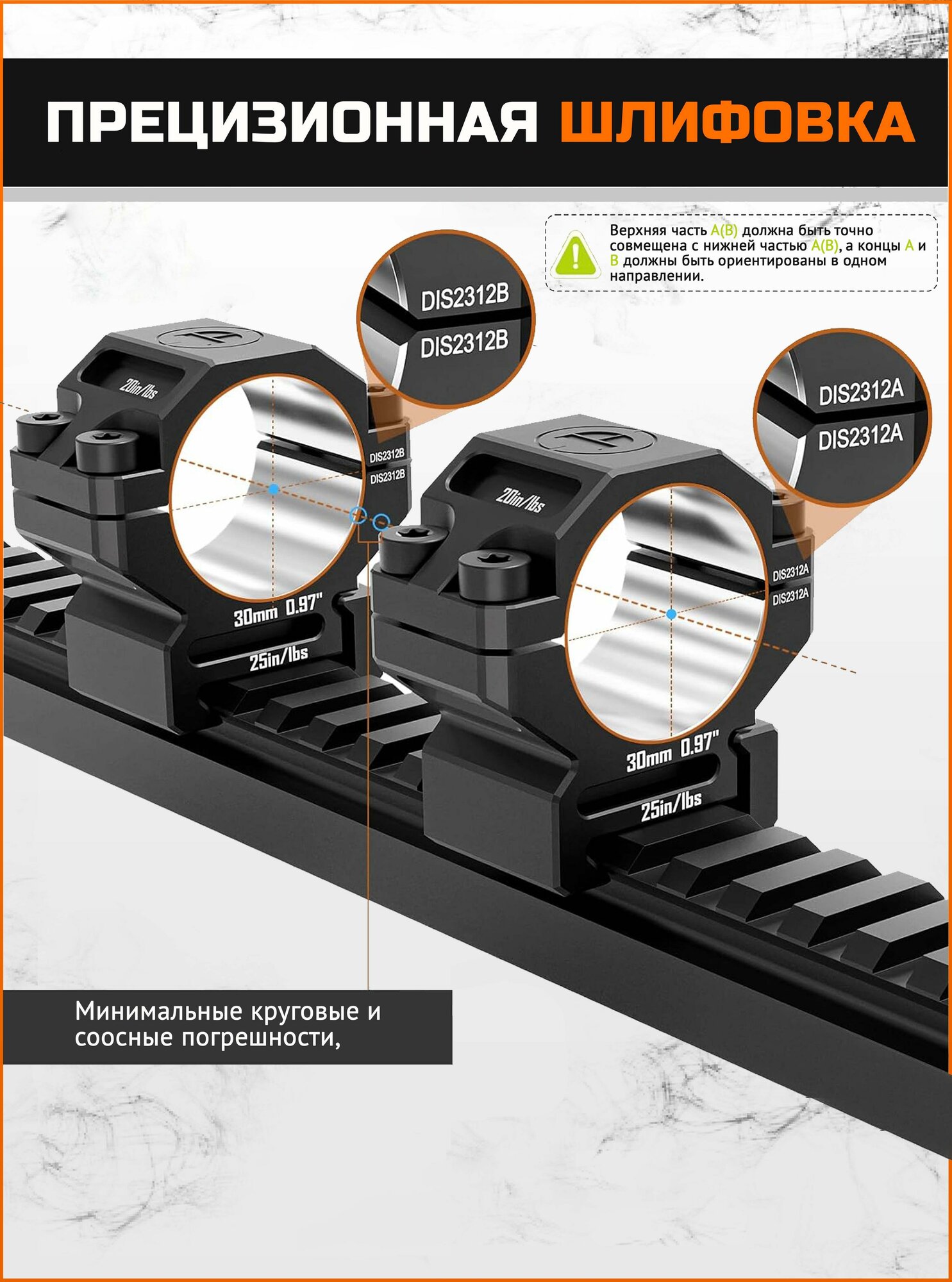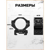 Совместимость: Кольца диаметром 30 мм поднимают центр оптической трубы на высоту 24,63 мм (0,97 дюйма) от основания. Они подходят исключительно для планок стандарта Picatinny и не совместимы с планками Weaver.