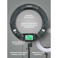 Лампа кольцевая со штативом имеет большой LCD дисплей с подсветкой, пульт дистанционного управления, USB разъем для зарядки телефона, крепление для телефона и возможность работы от аккумуляторов. LCD Дисплей показывает яркость и цветовую t. Крепление для телефона и фотоаппарата (для любых моделей смартфонов и фотоаппаратов GoPro). Телефон можно крепить вертикально и горизонтально