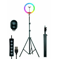 Селфи-пульт в подарок! Цветная универсальная кольцевая LED RGB - лампа со штативом, диаметром 30 см обеспечит мягкий студийный свет для портретной или предметной фотосъемки. Применяют блогеры, фотографы, визажисты. Имеет 3 режима белого (теплый, холодный, нейтральный) + множество вариаций цветного свечения + регулировка яркости и скорости. В комплект входит напольный штатив высотой от 70 см до 190 см, держатель для телефона, селфи пульт. Управление съемкой С помощью BLUETOOTH. (входит в комплект) Лампа отличается высокой яркостью, дает студийную подсветку, светодиоды светят мягко и аккуратно, отсутствуют блики. Плавно регулируется яркость и цветовая температура. Лампа обладает высоким качеством и долгим сроком службы. Держатель подойдет для смартфона от 5,8 до 8,5 см. Питание через USB (адаптер не входит в комплект). Нет ультрафиолетового и инфракрасного излучения. Производитель оставляет за собой права менять дизайн упаковки. Диаметр лампы: 30 см Мощность лампы :22 Вт Источник света: 180 штук LED SMD Цветовая температура: 3200-5600 К