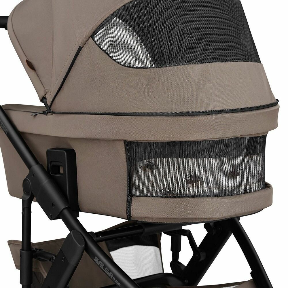 Для малыша с рождения на шасси устанавливается полноценная люлька для новорожденного (размеры по матрасику 76х36 см). Кнопки фиксатора имеют «эффект памяти»: люльку можно снять одной рукой, нажимая на кнопки поочередно. В модели Salsa 4 Air 2023 имеет окошко в люльке и съемный защитный подголовник на матрасике. В дополнительном сегменте в капюшоне есть вентиляционно-смотровое окошко. В капор встроена ручка для переноски, которая для удобства родителей имеет накладку из практичной эко-кожи. Защиту от ветра и холода обеспечивает накидка на ножки с отворотом.