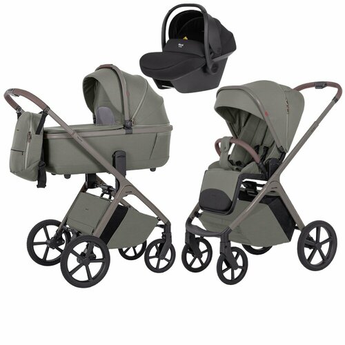 Комплектация включает в себя шасси с колесами, люльку с матрасиком и чехлом на ножки, прогулочный блок с капюшоном и бампером, автокресло с накидкой на ножки, дождевик, москитную сетку, вместительную корзину для покупок и практичный рюкзак для мамы.