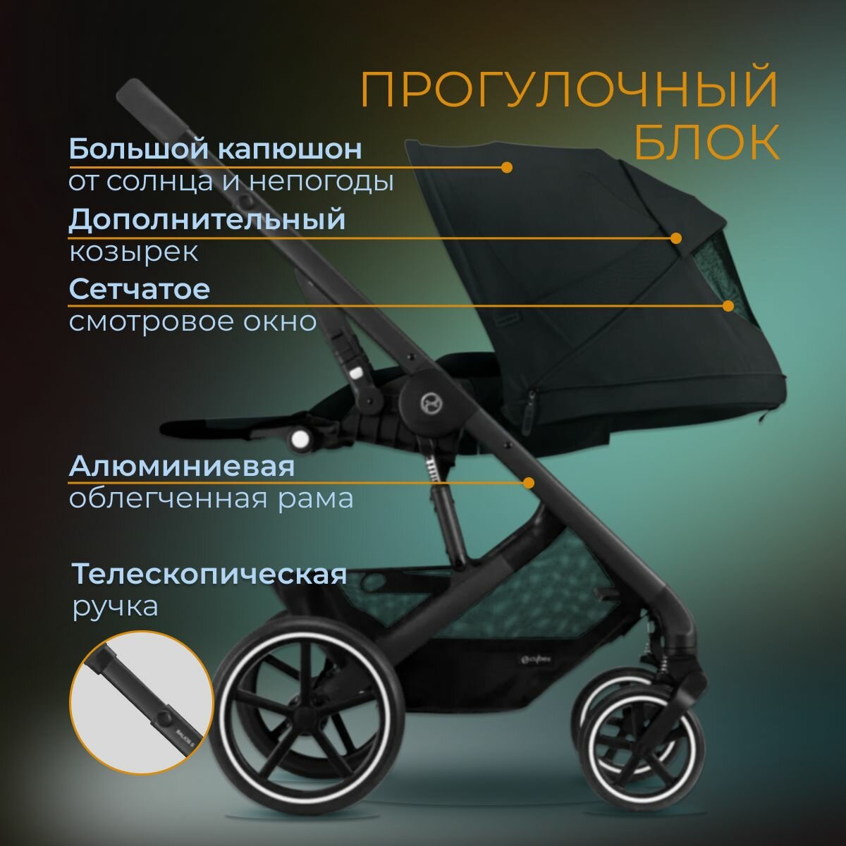 - в комплекте: прогулочная коляска, спальный блок, автокресло Cybex Aton B2 i-Size, адаптеры для установки автокресла, дождевик для сиденья