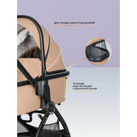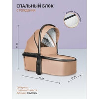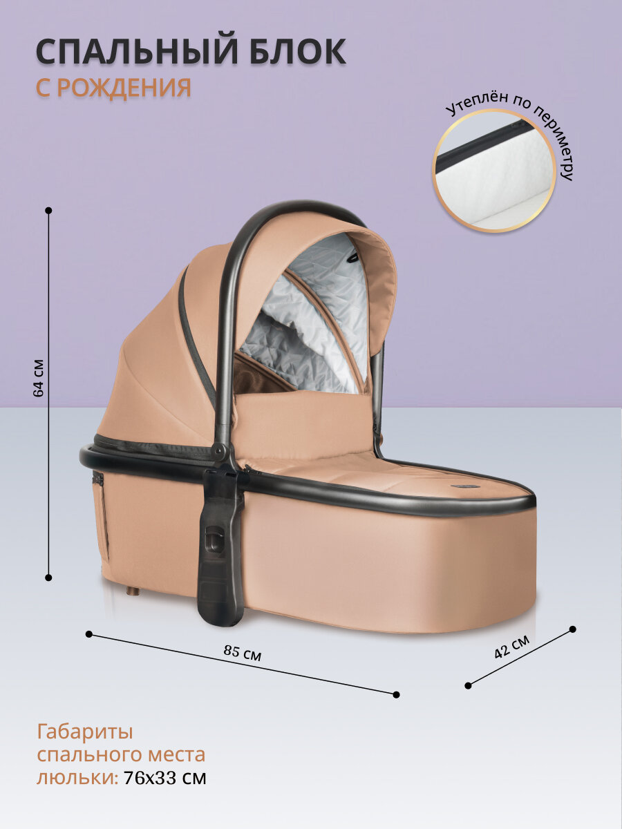 Спальный блок утеплен по периметру, что обеспечивает дополнительную защиту от холода. В капоре есть скрытая секция с москитной сеткой, что позволяет проветривать коляску в теплое время года. Вес блока с шасси составляет 10,9 кг.