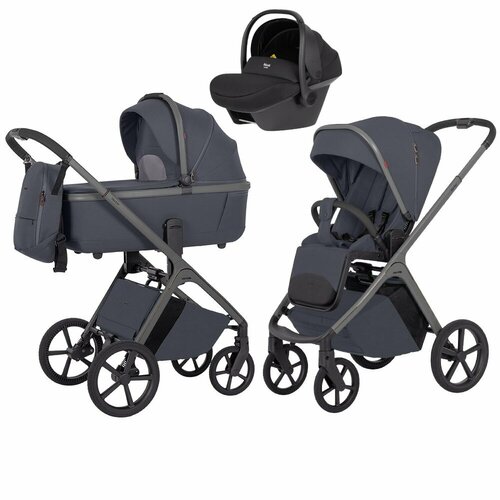 Комплектация включает в себя шасси с колесами, люльку с матрасиком и чехлом на ножки, прогулочный блок с капюшоном и бампером, автокресло с накидкой на ножки, дождевик, москитную сетку, вместительную корзину для покупок и практичный рюкзак для мамы.