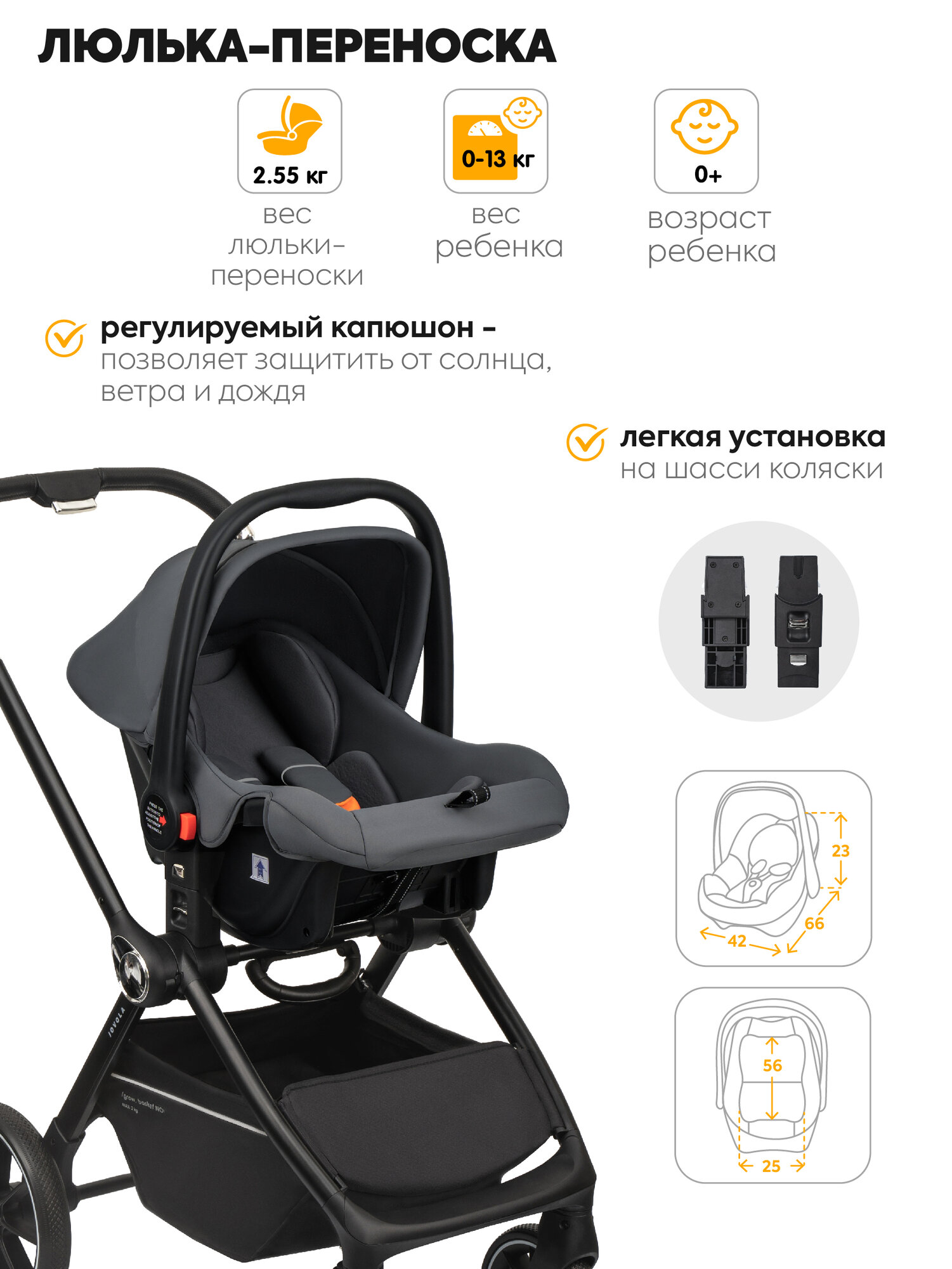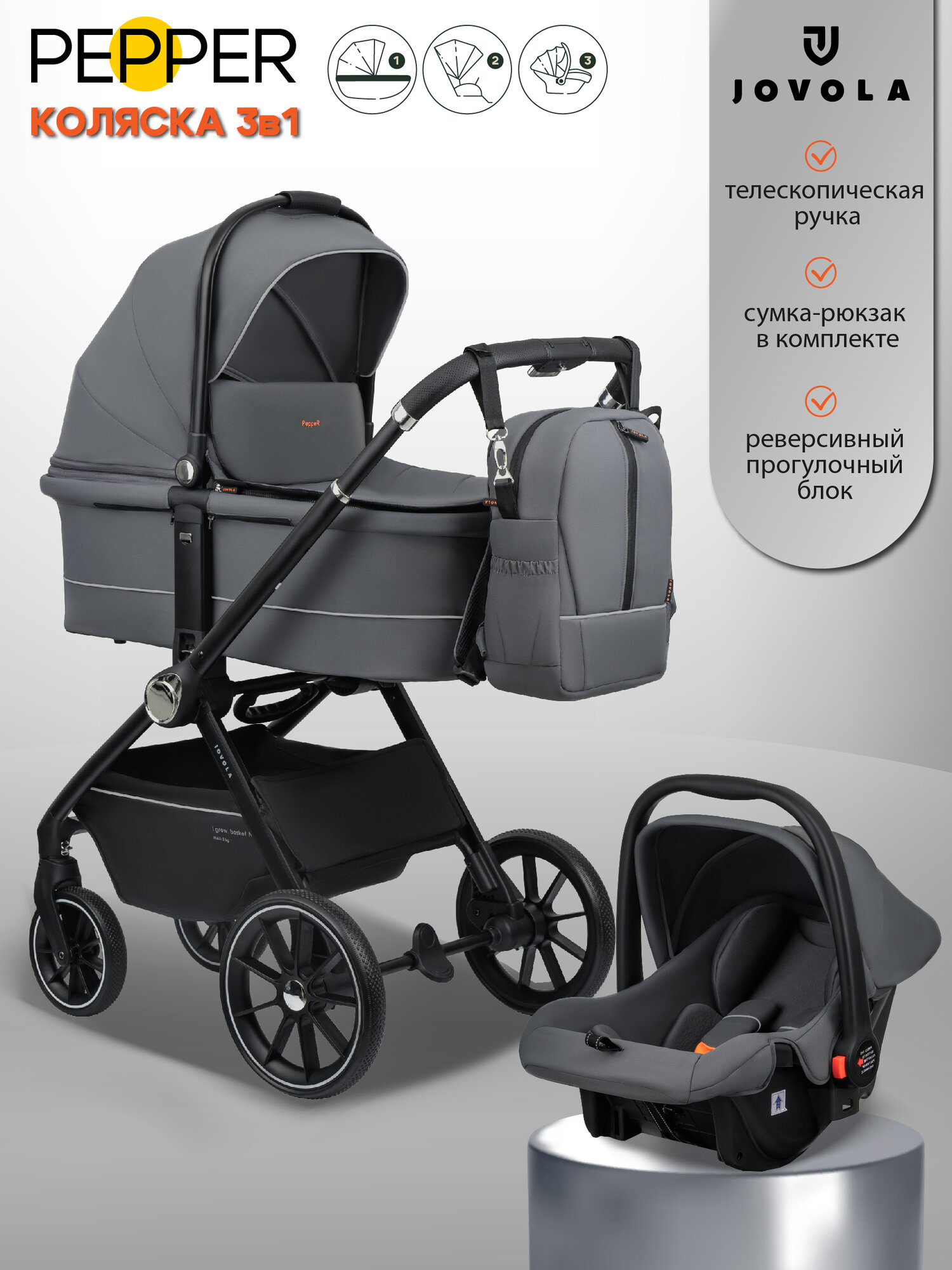 Детская универсальная коляска 3 в 1 Jovola Pepper, всесезонная, реверсивный блок, темно-серый: сравнение цен, характеристики, фото, актуальное наличие и цены.