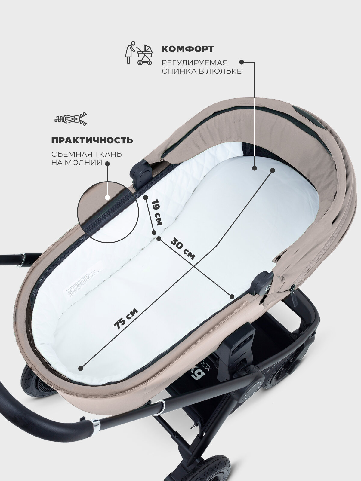 - Коляска складывается одной рукой вместе с прогулочным блоком, имеет скрытую секцию на молнии для увеличения капюшона и утепленную накидку на ножки.