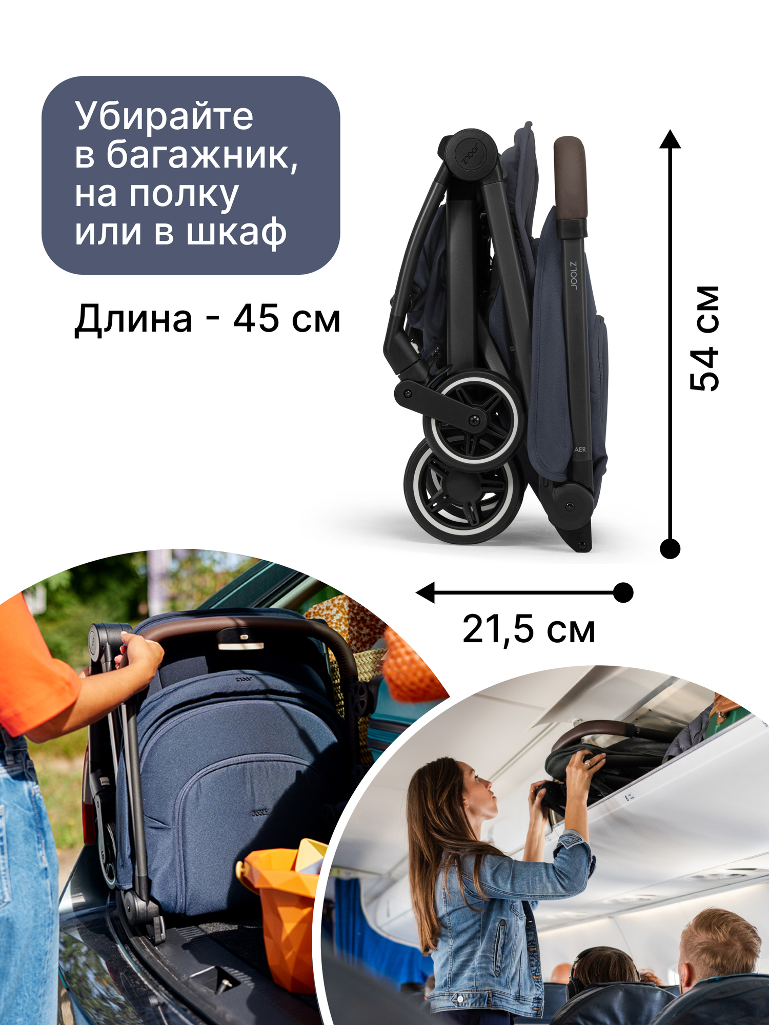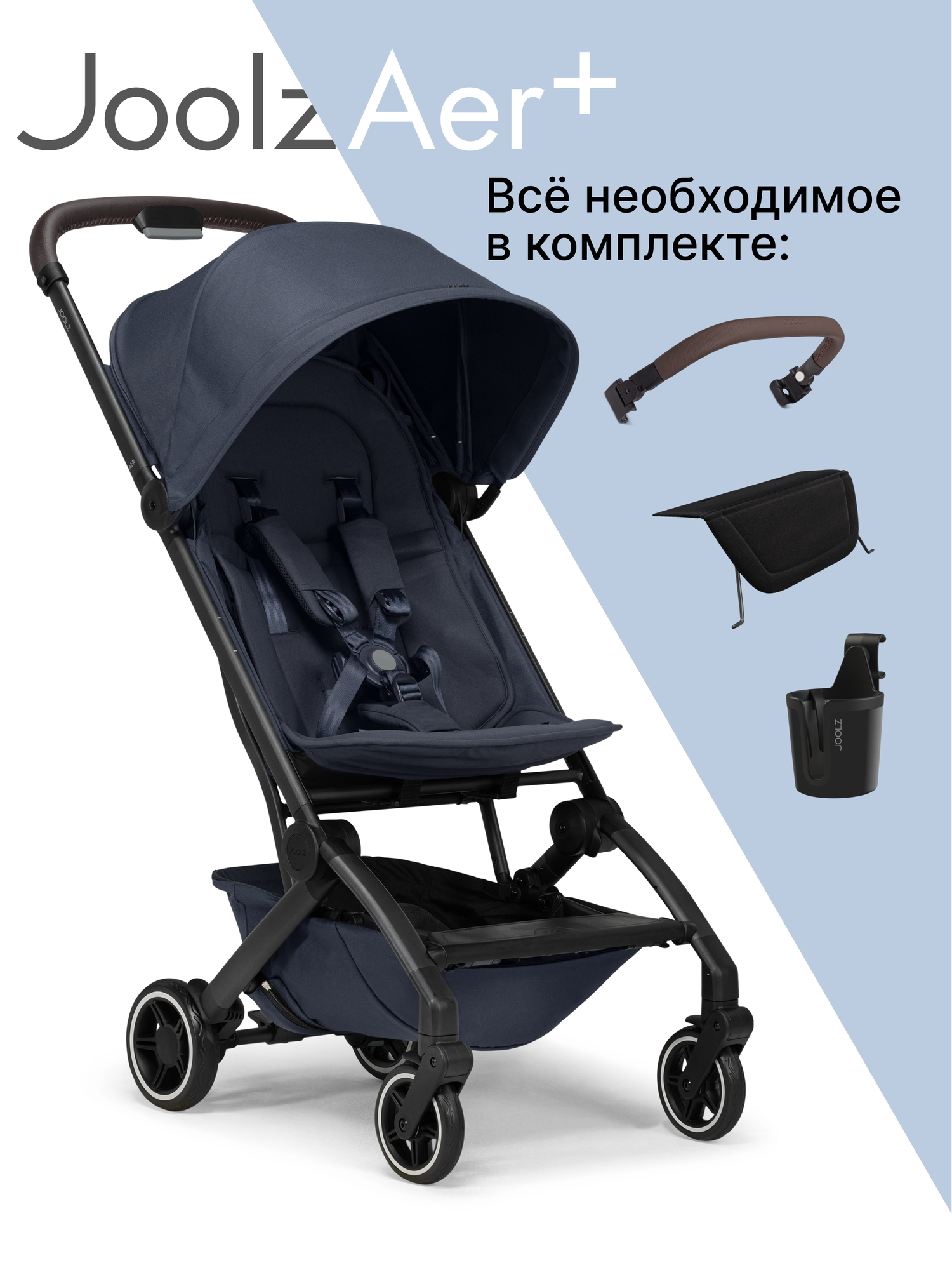 Купить Коляска Joolz Aer+ Navy Blue c бампером, подножкой и подстаканником, синяя, легкая и компактная прогулочная коляска для путешествий с доставкой по всей России.