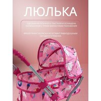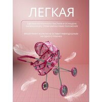 Коляска подходит для кукол высотой до 50 см, люлька просторная и устойчивая. Регулируемая по высоте ручка позволяет адаптировать коляску под рост ребёнка. Мягкие колёса из вспененного материала обеспечивают бесшумное и плавное движение по полу, асфальту и другим поверхностям. Складной капюшон добавляет реалистичности и защищает куклу от яркого света во время прогулки.