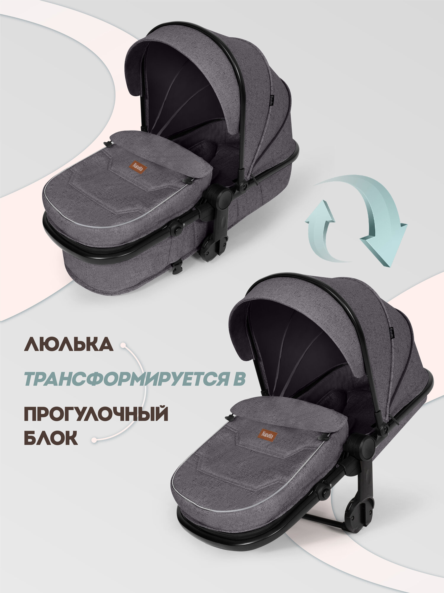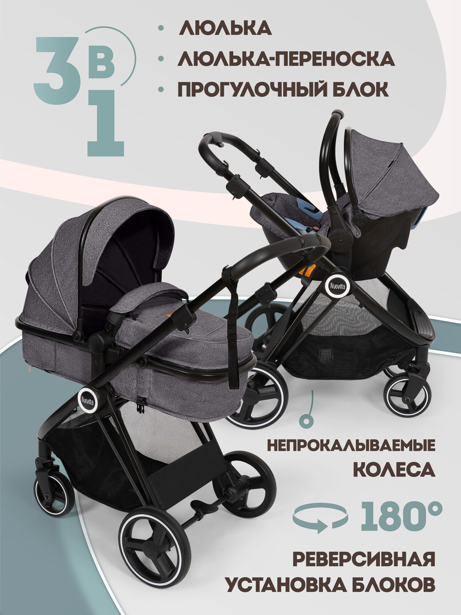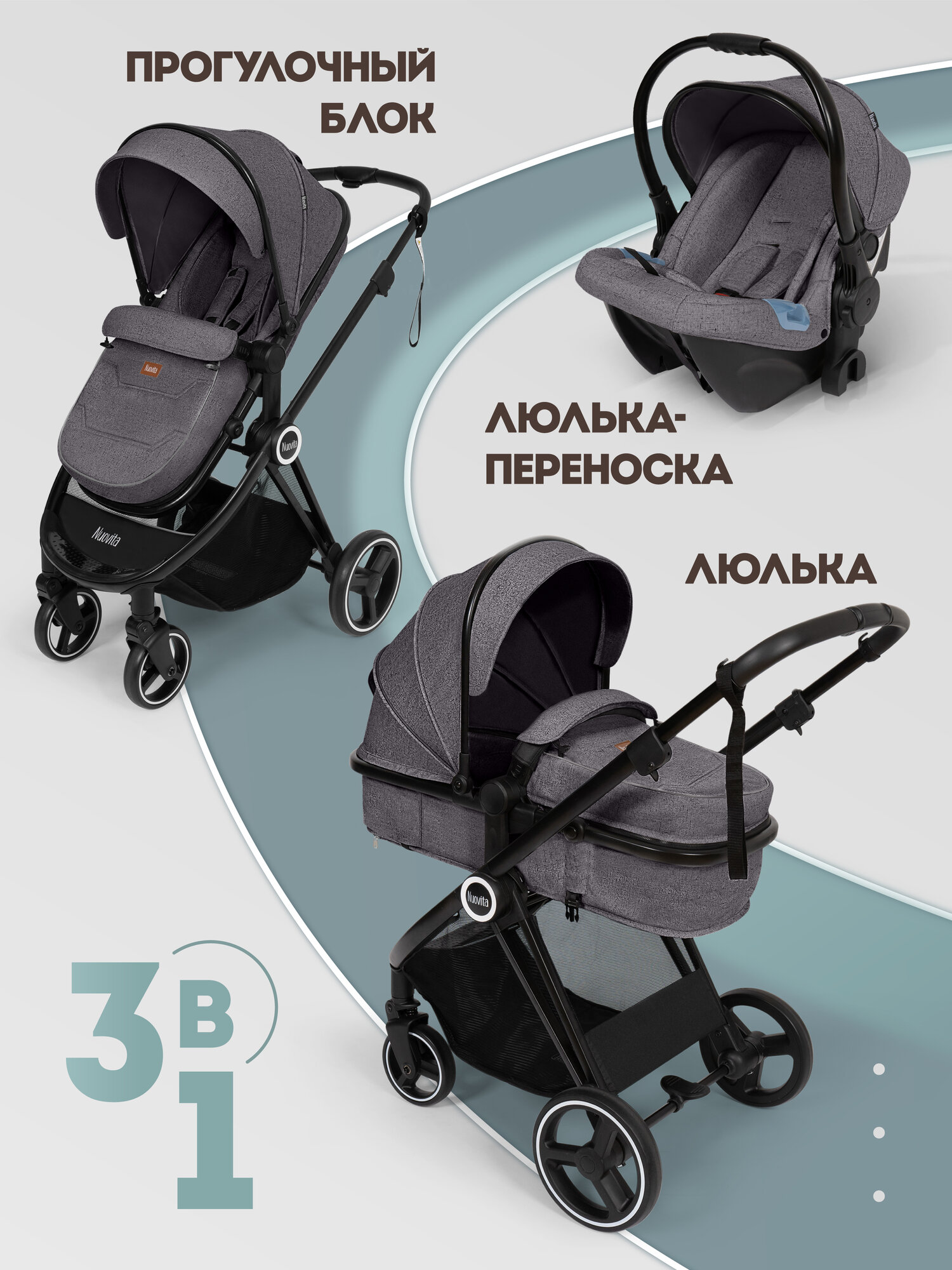 Купить Коляска Nuovita «Grigio», для новорожденных, универсальная, 3в1, люлька, прогулочный блок, автокресло с доставкой по всей России.