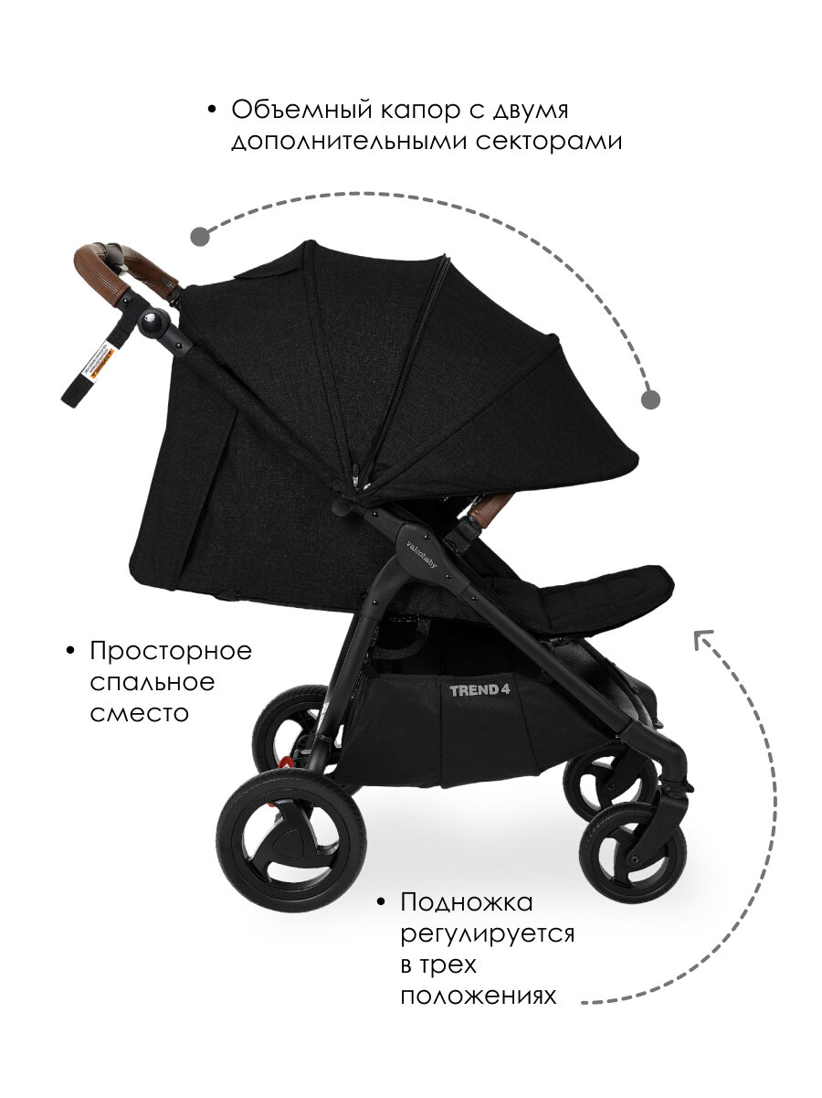 спинка регулируется бесшумно и плавно; при нажатии на педаль тормоза не пачкается верхняя часть обуви; спинка: ременная регулировка, наклон от 100° до 170°; подножка регулируется в 3-х положениях; возможность установки автокресла при помощи Адаптера Maxi Cosi / Snap & Snap 4 (приобретается отдельно); самостоятельно стоит в сложенном виде