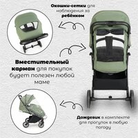 Капюшон дополнительно удлиняется, имеет секцию для проветривания на задней части спинки и окошко для присмотра за малышом. Ткани с защитой +50 UV.