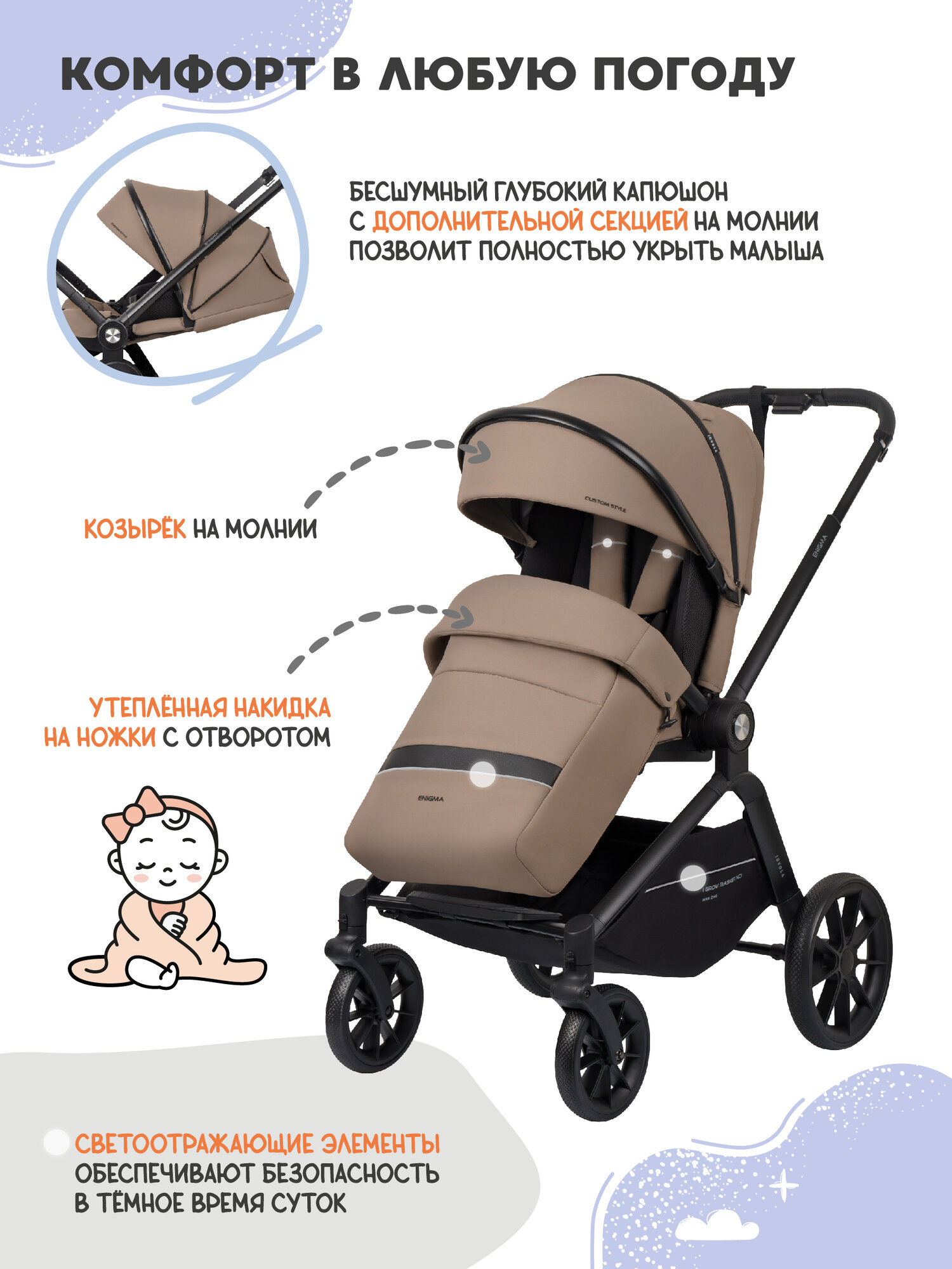 Детская, прогулочная всесезонная коляска Jovola Enigma идеальна для прогулок с малышом с 6 месяцев до 3 лет, в любую погоду, круглый год. Внешний чехол из водоотталкивающей, непродуваемой ткани, с защитой от ультрафиолета позволяет использовать коляску как зимнюю и летнюю. Утепленный, глубокий капюшон, с дополнительной секцией на молнии, надежно защищает ребенка в холодную погоду, также как утепленная накидка на ножки на молнии, с дополнительным отворотом от ветра. Сидячий блок реверсивный. Его установка возможна в 2х положениях- лицом к миру или к маме. Это очень удобно если во время прогулки возникает необходимость отвернуть ребенка от ветра или яркого солнца, или просто повернуть к себе. Спинка регулируется в трех положениях, в том числе в лежачее. Дополнит спальное место регулируемая подножка в верхнем положении. Пятиточечные ремни безопасности, съемный бампер и разделитель для ножек обеспечивают надежную фиксацию во время движения. Светоотражающие элементы с разных сторон делают коляску более заметной в темное время суток. Подножка, бампер и телескопическая ручка изготовлены из качественной экокожи и практичны в уходе. Для проветривания предусмотрено окошко в капюшоне. Хорошую проходимость и мягкость хода обеспечивают большие колеса с амортизацией, из современного, практичного материала EVA. Передние поворотные, с возможностью фиксации для прямолинейного хода. В комплекте москитная сетка, корзина для багажа. Складной механизм книжка. Большой выбор цветовых решений для девочки и мальчика.