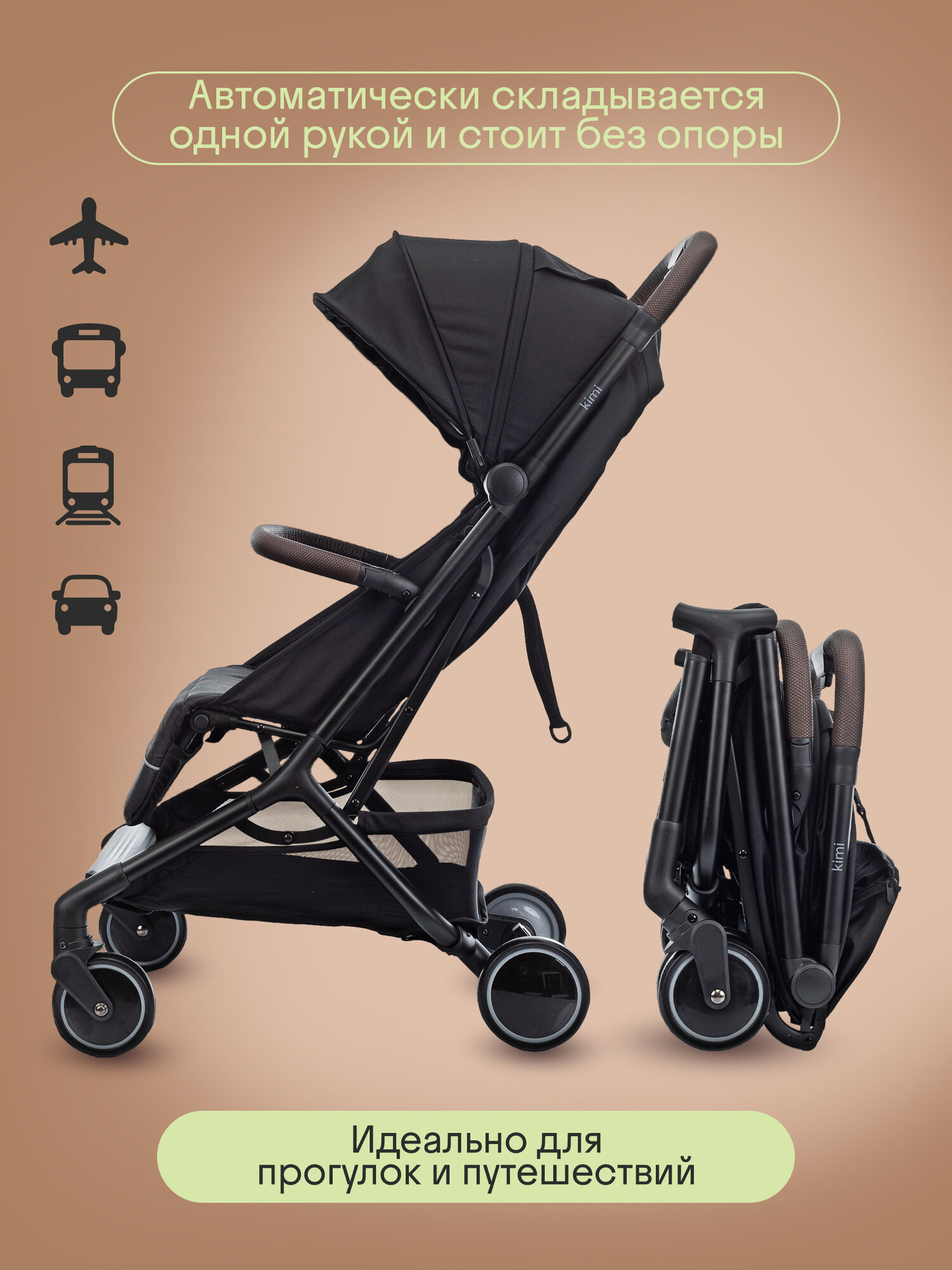 Купить Коляска прогулочная детская Kidzi Kimi, складная, для путешествий, с подстаканником, дождевиком и москитной сеткой, черный с доставкой по всей России.