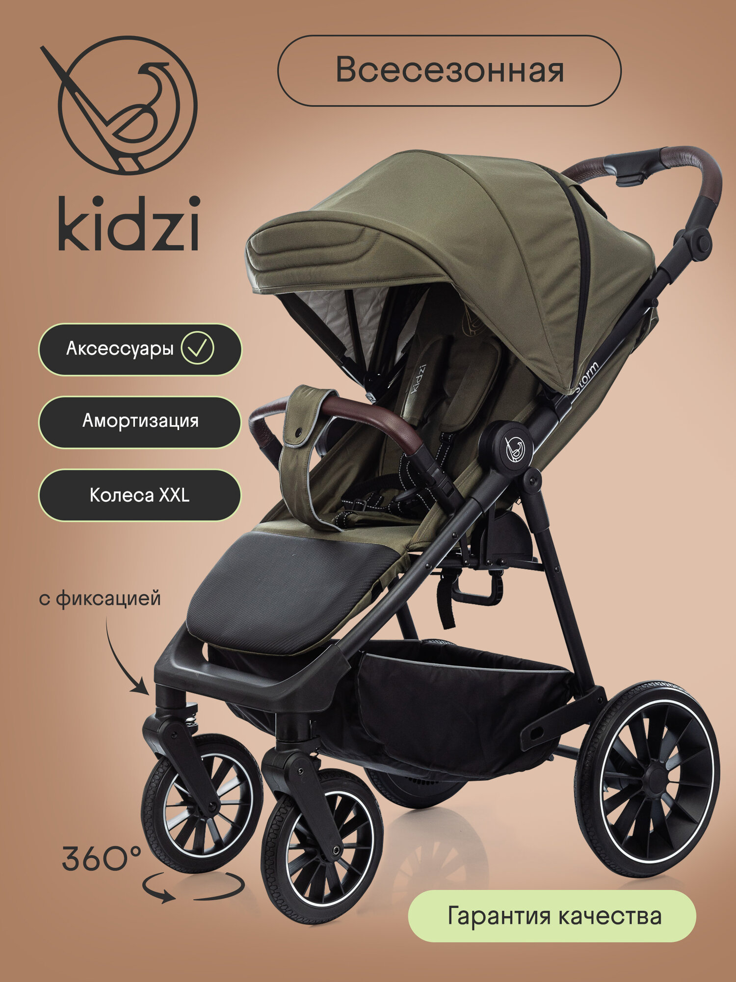 Купить Коляска прогулочная детская Kidzi Storm, всесезонная, c накидкой для ножек, дождевиком, подстаканником и москитной сеткой, оливковый с доставкой по всей России.
