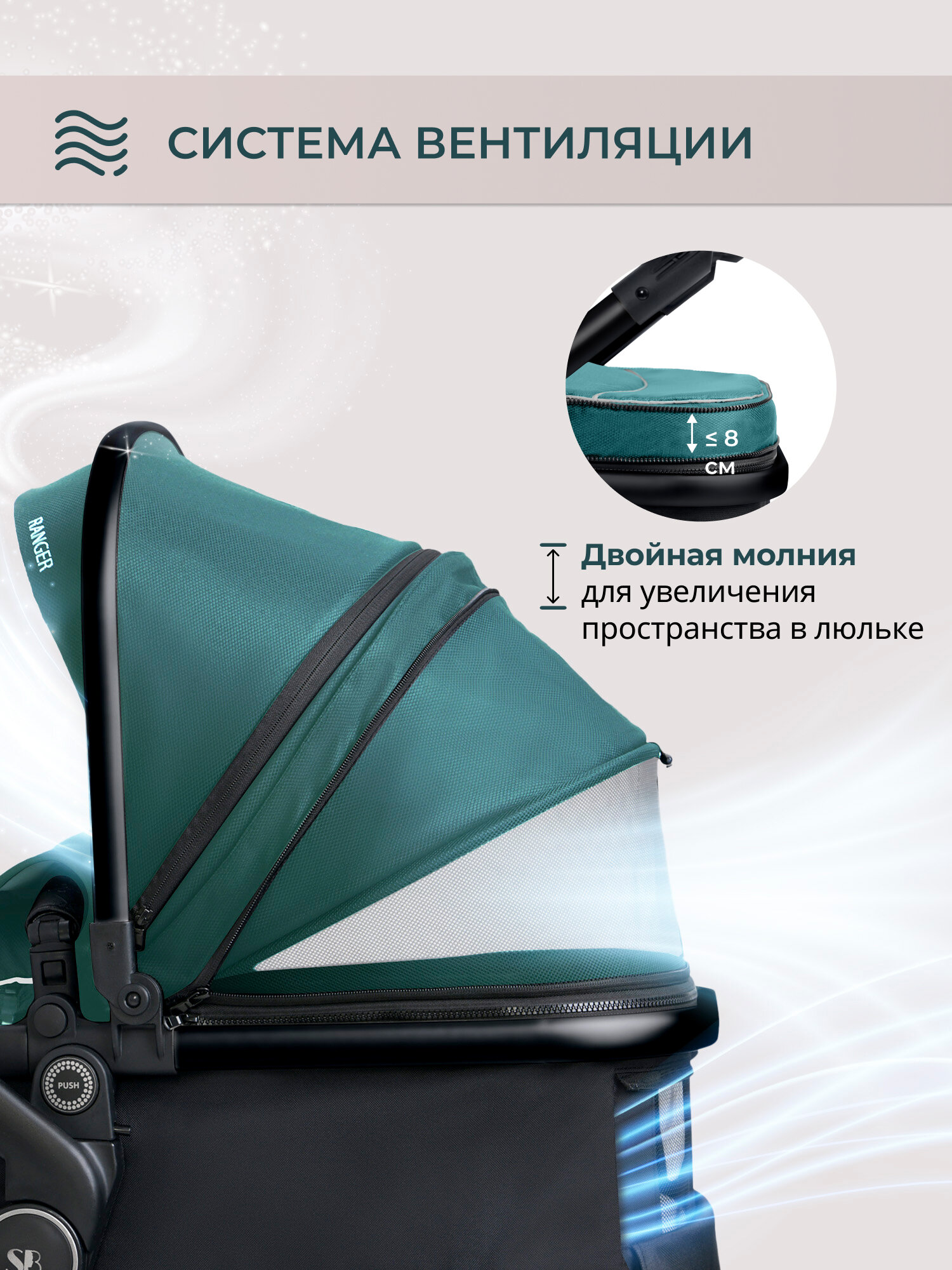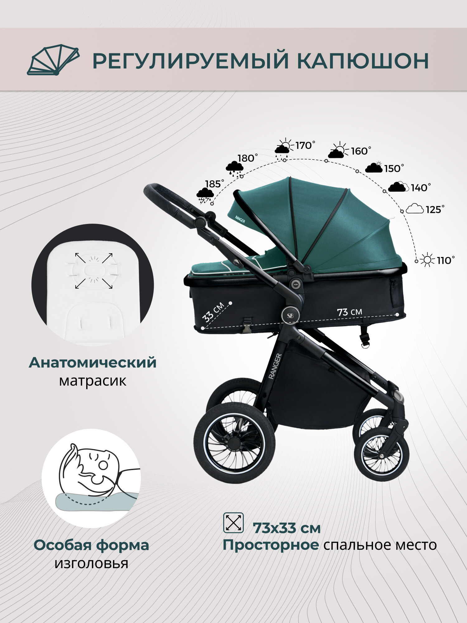 | Особенности капюшона | вентиляция, капюшон опускается до бампера, материал с УФ-защитой, смотровое окно |