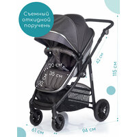 Характеристика модели: Размер коляски в разложенном виде: 94 х 61 х 115 см (ДхШхВ) Размер коляски в сложенном виде: 95 х 61 х 42 см (ДхШхВ) Размер спального места: 82 х 35 см (ДхШ) Высота от пола до сиденья: 56 см Ширина сиденья: 35 см Длина сиденья: 20 см Высота спинки: 42 см Высота до ручки: 89 - 115 см Ширина передней оси: 34 см Ширина задней оси: 61 см Диаметр передних колес: 17 см Диаметр задних колес: 24 см Вес: 10,2 кг