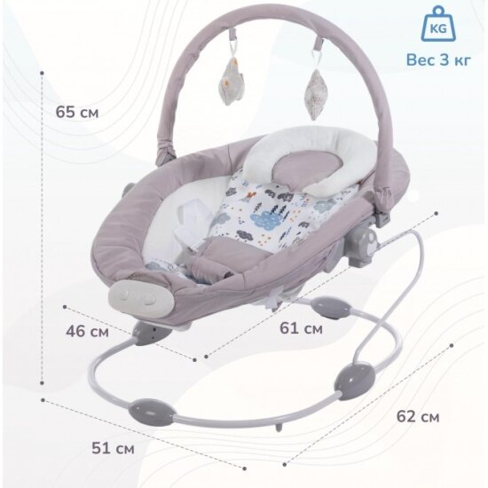 Forest kids Колыбель-баунсер Hagen предназначена для новорожденных и прослужит до тех пор, пока малышу не исполниться 6 месяцев. Как и у других моделей этого бренда, основание колыбели выполнено из металла, что позволяет выдерживать вес до 9 кг, каркас и держатель игрушек пластмассовые, а люлька обтянута тканью из полипропилена и хлопка. В спальном месте, размером 61х46см, малыш будет чувствовать себя уютно и комфортно. У данной модели есть несколько особенностей, отличающих ее от других колыбелей бренда: Музыкальный блок, вы можете включить крохе музыку, выбрав одну из 10 мелодий; Колыбелька Hagen оснащена съемной подушкой. Если малыш проснулся и ему требуется изменить положение, подушка легко убирается; Благодаря двум положениям наклона спинки вы можете уложить малыша спать, зафиксировав его в горизонтальном положении, или позволите ему развлекаться с мягкими игрушками, закрепленными на специальном держателе, переведя спинку колыбели в другое положение; Безопасность обеспечивает 3-х точечный полиэстеровый ремень. Функция вибрации придет на помощь, если вы заняты и не можете сами укачать свою кроху. Новая, эксклюзивная колыбелька-баунсер Hagen станет для родителей отличным помощником. Габариты (с дугой для игрушек): 62х51х65 см.
