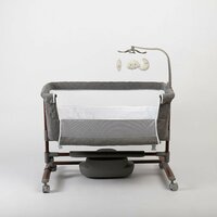 Кроватка оснащена колесиками со стопором на каждом колесе. Высота ложа регулируется в 8 положениях, можно установить угол наклона для естественного срыгивания. В нижней части каркаса расположен блокиратор укачивания. Один бортик опускается, что позволяет использовать колыбель в качестве приставной кроватки для совместного сна с родителями. Для развлечения малыша над люлькой расположена мобиль-карусель с 3-мя игрушками.