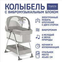 Колыбель Simplicity 3010 Classic (симплисити) - это современная колыбель-кроватка со множеством полезных функций и стенками из сетчатых вставок. В такую колыбель всегда будет доступ воздуха, внутреннее пространство в ней хорошо проветривается и ребенок не будет перегреваться. Поэтому данная колыбель идеально подходит для квартир с системами центрального отопления или для сна в жаркую погоду. Немаловажным плюсом для мамы будет и возможность наблюдать за ребенком, не подходя к колыбели, а ребенок сможет самостоятельно уже с первых дней жизни исследовать окружающий его мир. Вторым важным плюсом этой модели является просторное спальное место, которое позволяет с удобством раскинуться даже крупному малышу. Сверху каркас колыбели закрыт мягкой накладкой, внутри находится матрасик, на который надета простынка с резинкой. Для защиты от наружного света предусмотрен складной капор, в среднем отсеке которого имеется сетчатая вставка для улучшения вентиляции. В комплекте с колыбелью поставляется современный музыкальный мобиль с подвесными игрушками, который работает от батареек. Особенностью модели Simplicity 3010 Classic является возможность установки мобиля как справа, так и слева на люльке колыбели. Мобиль выполняет множество функций: ночная подсветка, бегающие огоньки, виброукачивание, вращение игрушек и проигрывание мелодий. Присутствует регулировка интенсивности вибрации и громкости музыки, а также таймер. Виброукачивание используется для снятия коликов у новорожденных. Внизу изделия находится тканевая корзина для хранения мелочей, которая крепится к ножкам при помощи пластиковых пуговиц, благодаря чему ее можно легко снять для чистки. Конструкция изготовлена из алюминиевого профиля и ударопрочного пластика. Ножки-распорки снабжены нескользящими накладками, что обеспечивает колыбели хорошую устойчивость на любом напольном покрытии. В просторной и удобной колыбели Simplicity 3010 Classic со стенками из сетчатых вставок малышам уже в первые месяцы жизни будет комфортно и не жарко, а виброукачивание поможет от коликов.