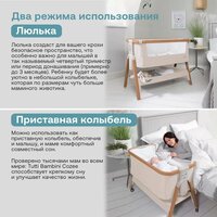 • колыбель может использоваться как приставная – просто отстегните молнии по бокам, опустите тканевый бортик вниз, снимите деревянную перекладину сверху и зафиксируйте колыбель при помощи специальных ремней