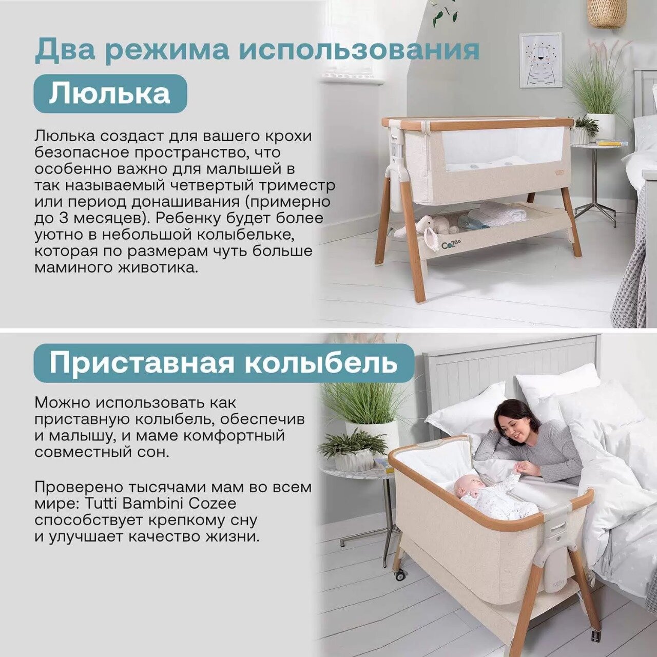 Кроме того, Tutti Bambini CoZee идеально подходит для комфортного совместного сна. Отрегулируйте высоту детского ложа, снимите боковой борт и приставьте колыбель к родительской кровати – так Вы сможете быть рядом с малышом всю ночь, при этом не лишая ни его, ни себя собственного пространства для сна.
