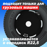 Колёсные колпаки - надёжная защита для грузовых автомобилей, автобусов и коммерческого транспорта. Изготовлены из прочного, легкого и гибкого пластика, что обеспечивает долговечность и удобство использования. Установка колпаков на колёса поможет уменьшить износ, вероятность повреждения и загрязнения колёсных дисков. Колпаки легко крепятся в посадочную канавку с упором в борт штампованного диска и защёлкиваются с помощью пружинной проволоки, которая установлена по периметру колпаков. Пластиковые колпаки на грузовик - универсальные, подходят для большинства грузовых машин со штампованными колёсами типа "евродиск". Они сохраняют первоначальный вид продолжительное время, легки в эксплуатации, не боятся воды и грязи.