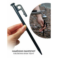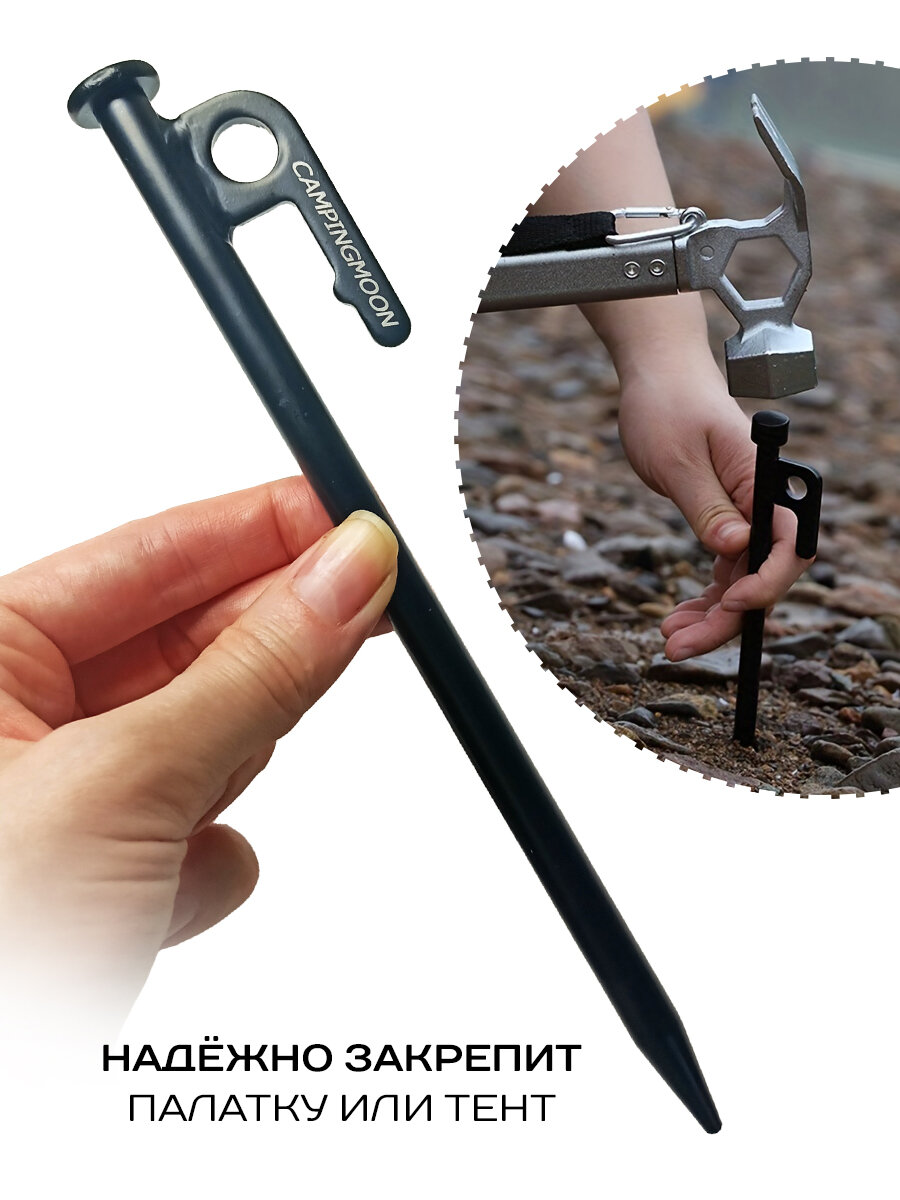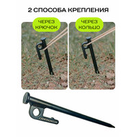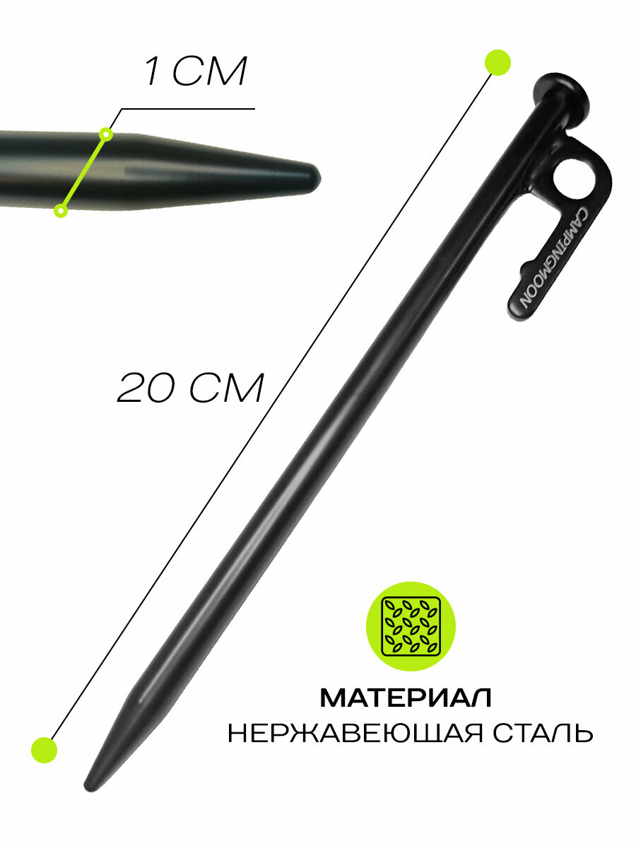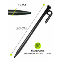 Крепление для палаточных укрытий представляет собой металлический штырь длиною 20 см из нержавеющей стали и со стальной головкой, покрытого матовой краской черного цвета. Головка кола крепко фиксируют палатку или тент на мягком грунте за счет большой длины гвоздя. За счет заостренного толстого наконечника стержень легко и надежно вбивается в грунт. Колышки не гнутся и не ржавеют, отлично держатся в земле.