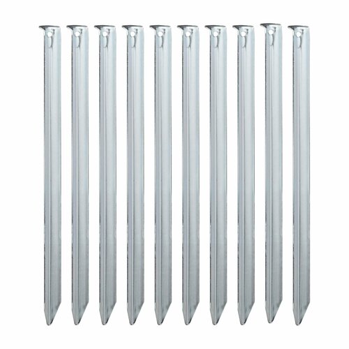 В наборе 10 штук. Длина 30 см, Ширина 2 см. Усиленные колышки выполнены из нержавеющей стали толщиной 1 мм, что обеспечивает долгий срок эксплуатации.