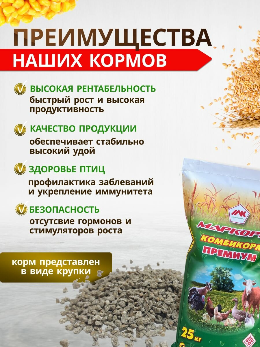 - Витаминный премикс: Обеспечивает необходимыми витаминами для поддержания здоровья и продуктивности.