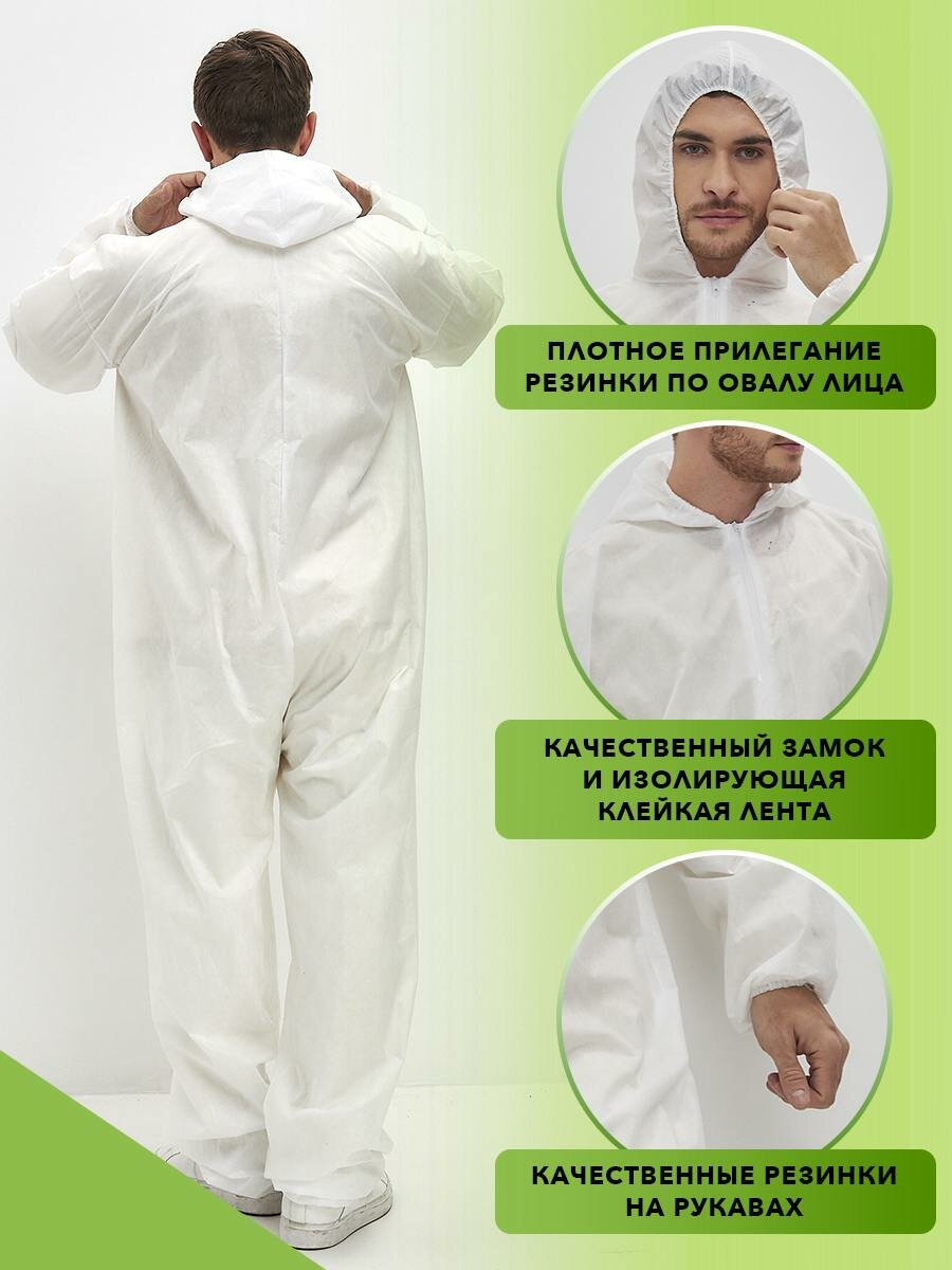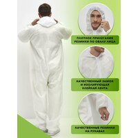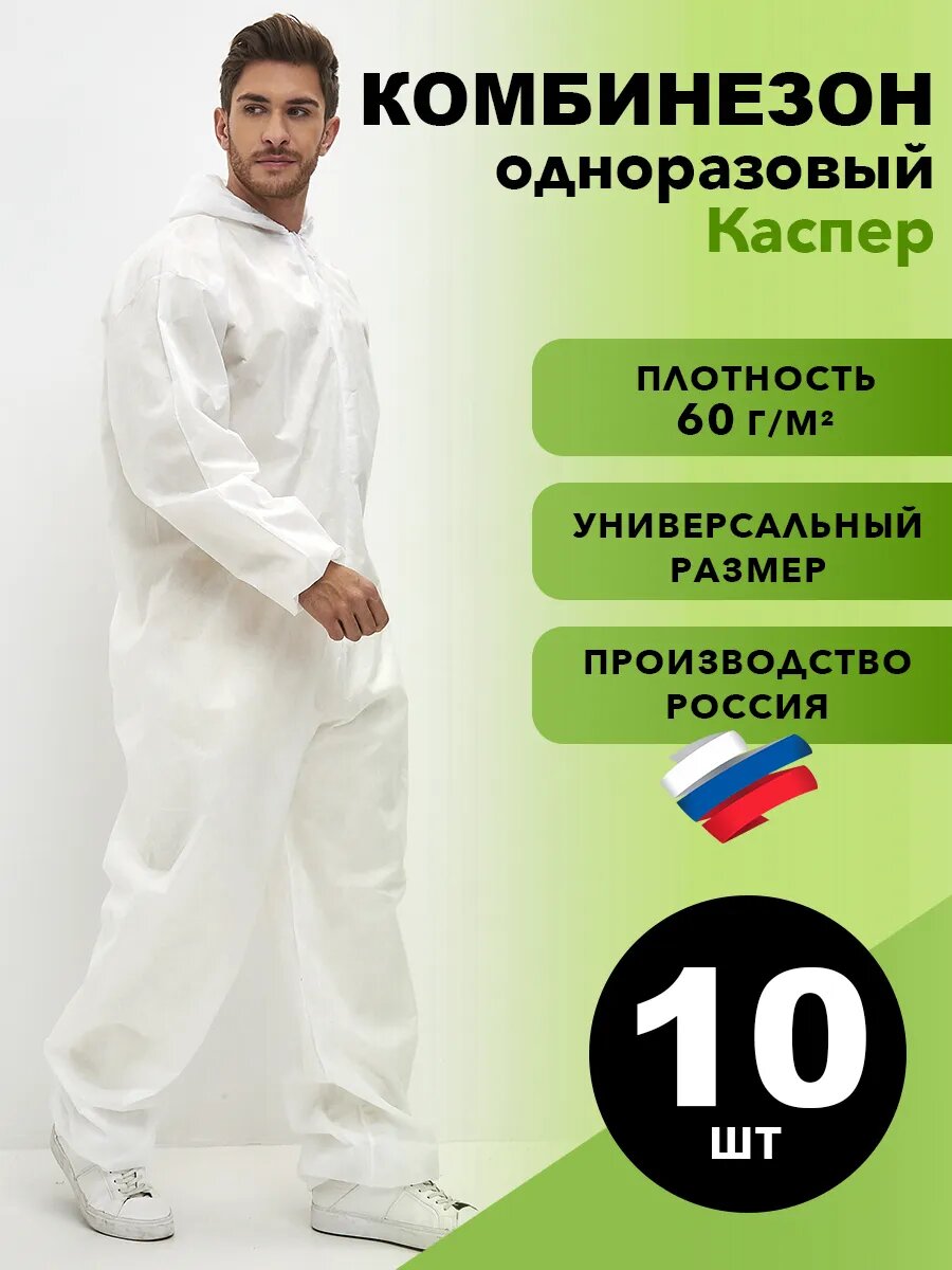 Продукт произведен в России и имеет белый цвет. В упаковке содержится 10 комбинезонов, которые подходят для мужчин и женщин.