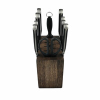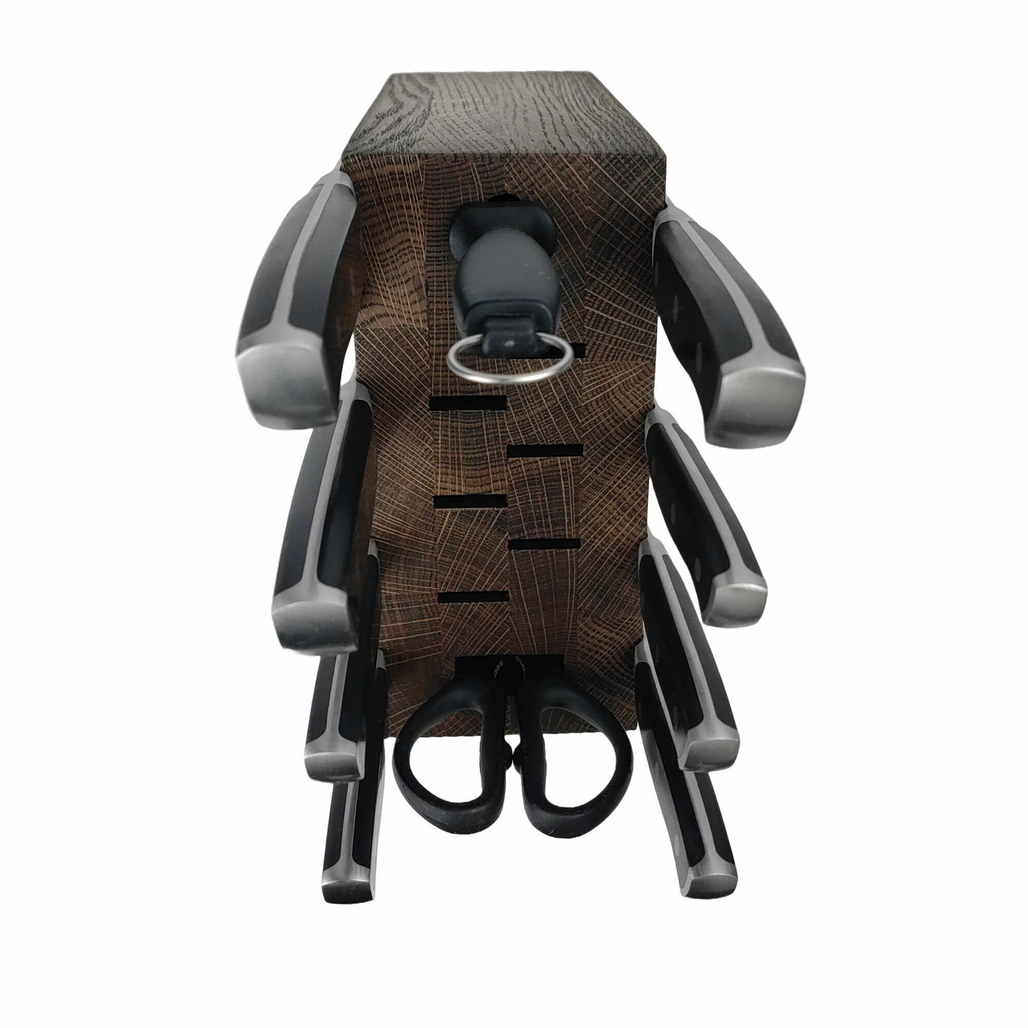Комбинированная подставка KS016SOB изготовлена из массива дуба и позволяет на минимальном пространстве разместить 8 ножей на местах с магнитным креплением, 6 узких (стейковых) ножей в специальных пазах, а также кухонные ножницы и мусат для заточки ножей. Подставка этой модели имеет широкое основание и большой вес (более 3-х килограмм), что делает ее устойчивой, а наличие силиконовых опор предотвращает качание. Каждый стальной нож на магнитной рабочей поверхности удерживается двумя мощными неодимовыми магнитами. Подставка изготовлена из массива натурального дуба столярной влажности и пропитана маслом с твердым воском. Не рекомендуется устанавливать на подставку мокрые или влажные ножи и переносить её с установленными ножами. Более подробно условия и особенности эксплуатации приведены в прилагающейся инструкции.