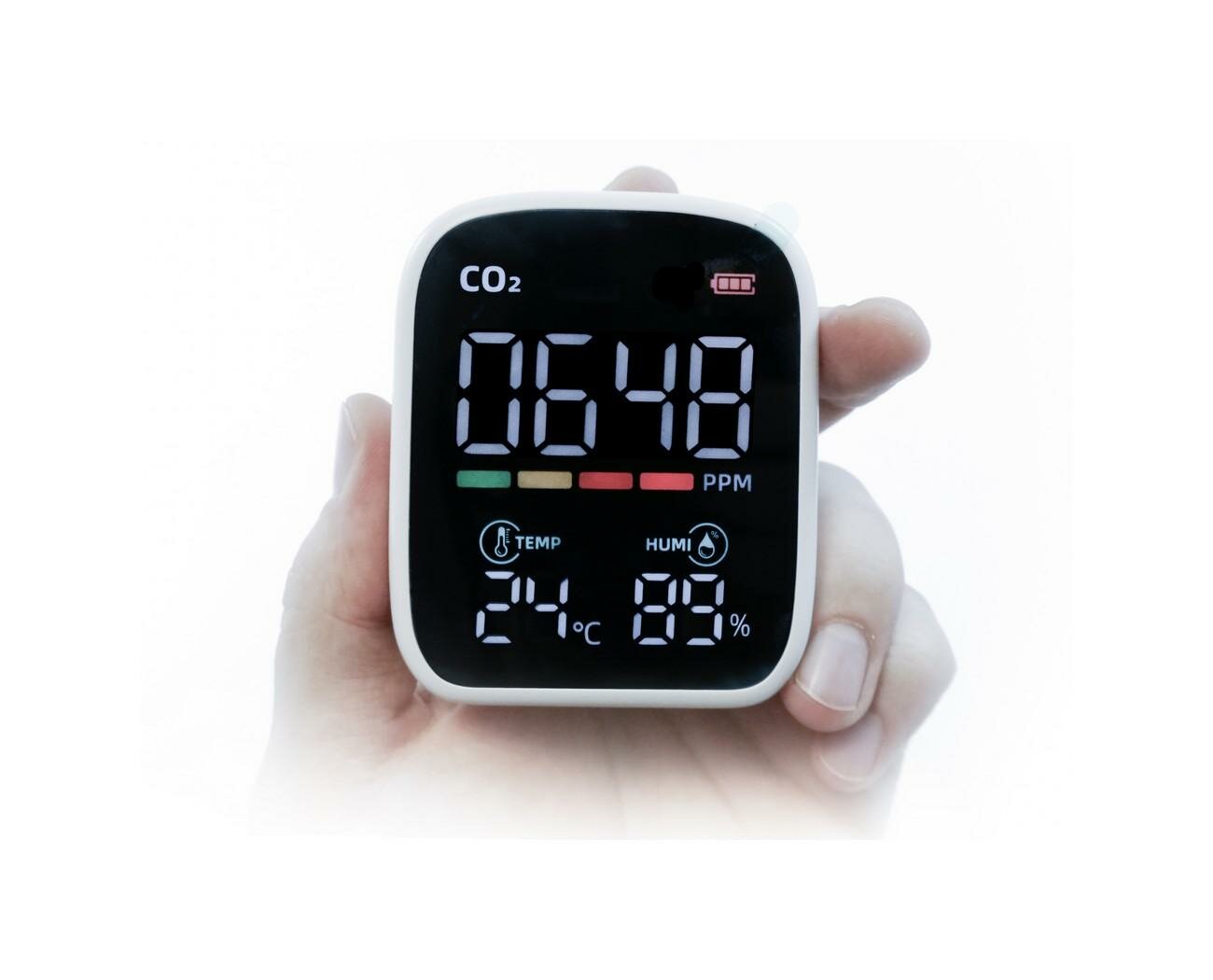 На цветном дисплее СтражГаз Мод:917-M7 отображаются значения концентрации углекислого газа, температуры и влажности. Кроме того, имеется световой индикатор, служащий для быстрого определения концентрации СО2. При высокой концентрации углекислого газа (более 1500 ppm) на датчике СтражГаз Мод:917-M7 срабатывает звуковая сигнализация. СтражГаз Мод:917-M7 питается от внутренней батареи и блока питания с разъемом USB.