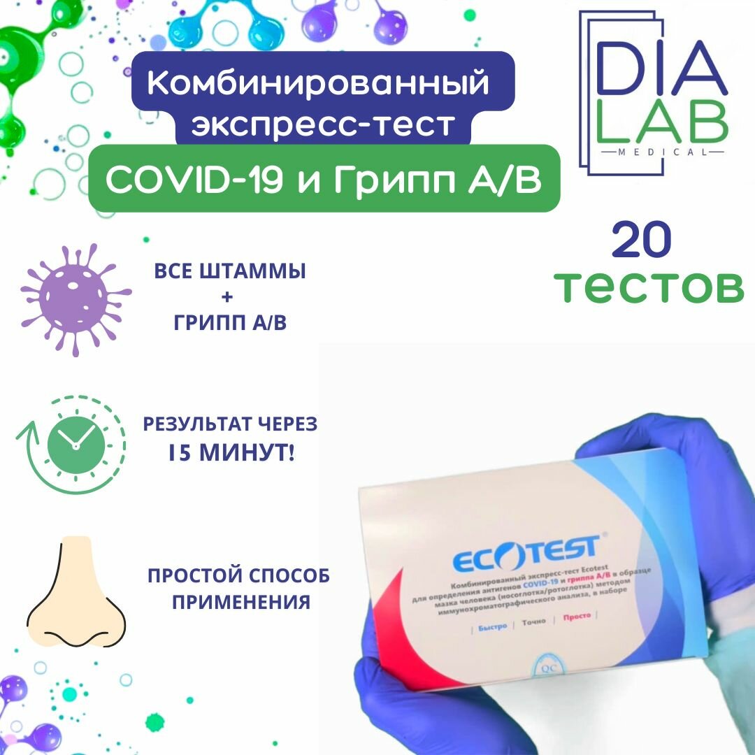 Комбинированный экспресс-тест Ecotest для определения антигенов COVID-19 и гриппа А/В в образце мазка человека: сравнение цен, характеристики, фото, актуальное наличие и цены.