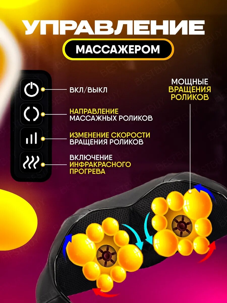 Массажер для плеч, шеи, талии, бедер, живота и ног. Представляем электрический массажер с подогревом для шеи, спины и тела - он идеально подходит для применения на руках, ногах и животе, а так же на все виды мышц благодаря своим многофункциональным характеристикам. Разработанный специально для снятия усталости и комплексного оздоровления. Используйте электрические импульсы для повышения эффективности тренировок и восстановления мышечной силы после нагрузок. Устройство оснащено 16 массажными роликами, 8 узлами и функцией инфракрасного прогрева. Аппарат для массажа оснащен возможностью выбора различных направлений вращения роликов и уровнем интенсивности вибрации, позволяющих индивидуально настроить процесс массажа под себя. Массажер бережно воздействует на мышечные ткани, улучшая кровообращение и способствуя тотальному релаксу. В комплектацию электромассажера входят блок питания для функционирования в домашних или офисных условиях, а также автомобильный адаптер для работы в машине. Вы можете насладиться всеми прелестями электротерапии, даже находясь за рулем автомобиля, ведь прибор оснащен специальным автомобильным адаптером. Сочетает в себе приятную на ощупь экокожу и дышащую нейлоновую сетку для максимального комфорта. Насладитесь преимуществами перкуссионного и вибрационного массажа для эффективного лимфодренажа и борьбы с целлюлитом. Сочетание техники гуаша и миостимуляции поможет вам в полной мере расслабить мышцы, укрепить кожу живота и ягодиц, придав тонус и эластичность. Роллерный аппарат подойдет для кистей рук, икр и стоп ног как виброплатформа. Технология шиацу точно воспроизводит приемы ручного массажа, что делает ее наилучшим средством для облегчения боли в пояснице и избавления от общего напряжения. Все режимы включаются пошагово, что обеспечивает легкость применения вибромассажера, в том числе для взрослых и пожилых бабушек и дедушек. Материал: искусственная кожа. Высота: 10 см. Ширина: 41 см. Длина: 50 см. Мощность: 5 Вт. Особенности: автоматическое отключение, регулировка интенсивности массажа. Комбинированный массажер для тела станет отличным подарком для мамы, папы, бабушки или дедушки. Позвольте себе несколько минут блаженства и почувствуйте, как отступает напряжение! Подарите прекрасный подарок на новый год!