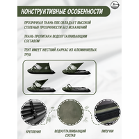 - Вторая — сам тент-трансформер. Он выполнен из влагостойкой тентовой ткани Оксфорд (крыша и периметр боковых стенок), прозрачной ткани ПВХ (большие смотровые окна) и крепкого металлического каркаса.