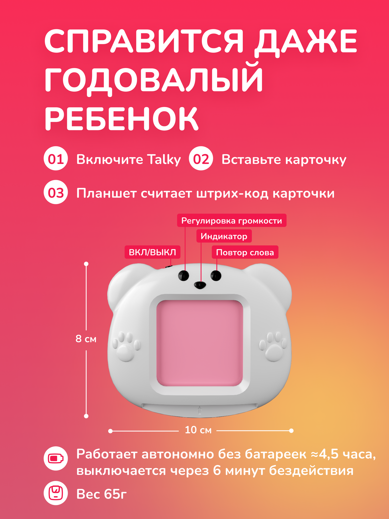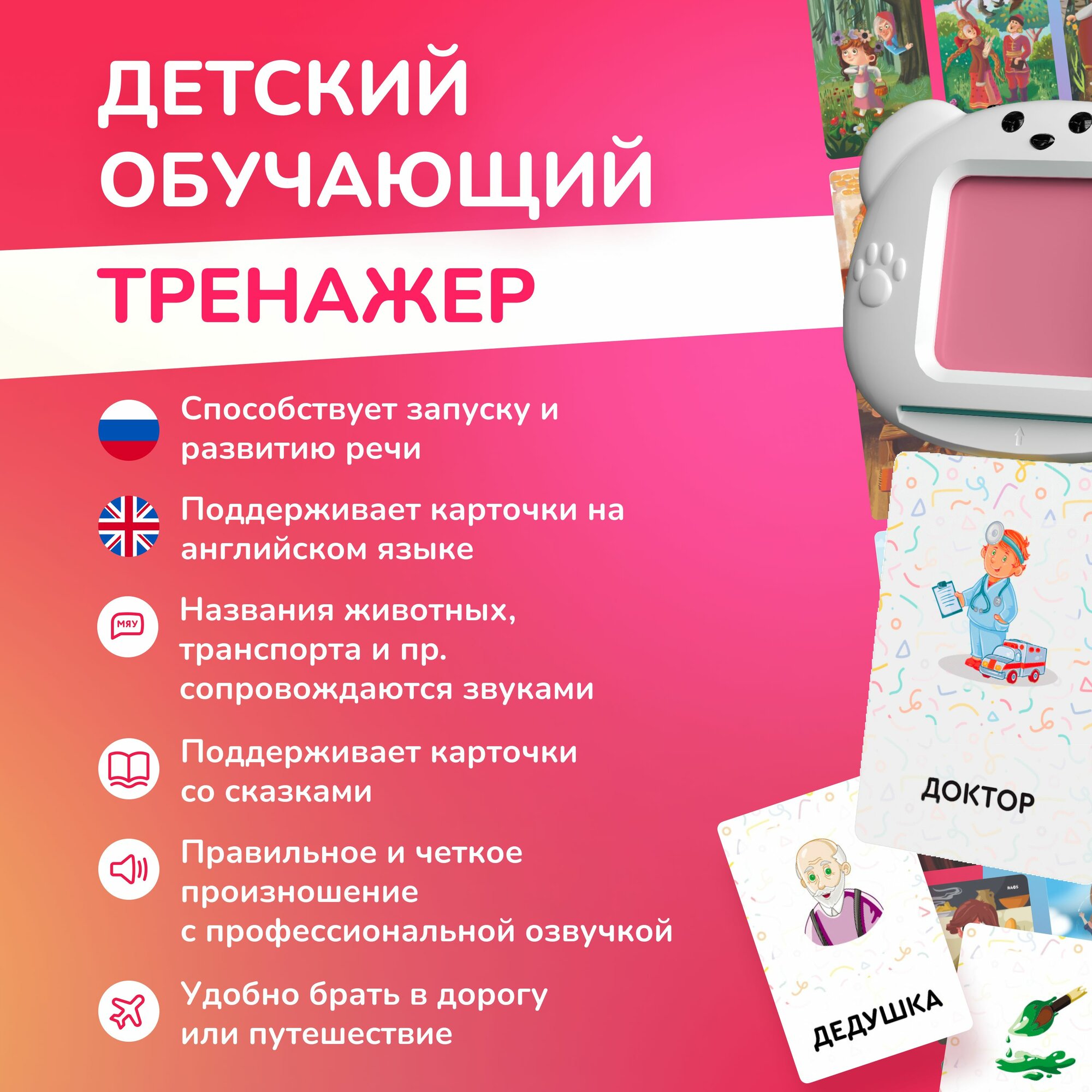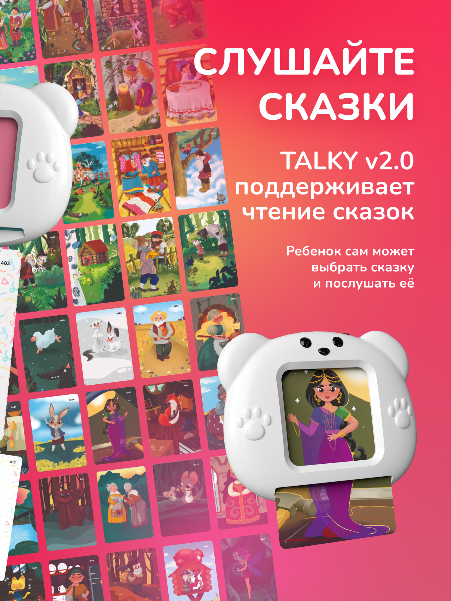 Бестселлер этого года - умные карточки TALKY. Talky поможет расширить пассивный словарный запас, развить мелкую моторику, запустить речь и весело выучить слова сразу на двух языках. Talky - вставьте умную карточку с QR-кодом на обратной стороне и устройство прочитает ее. В комплект входит 55 карточек на русском языке на разные тематики: семья, профессии, цвета, формы, природа, одежда + 2 набора сказок: Сказки Народов Мира и Терапевтические Сказки проект "Папашины Сказки". Остальные карточки на русском и английском языках и сказки продаются отдельно. Собери полную коллекцию карточек: На русском: Животные, 56 карточек Транспорт/дом, 56 карточек Еда, 56 карточек Семья/ профессии /цвета/ формы/ природа/ одежда , 55 карточек (уже входит в комплект) На английском: Animals, 56 карточек Transport/home, 56 карточек Food, 56 карточек Family/ professions/ colors/ forms/ nature/ clothes, 56 карточек Сразу на двух языках: Анатомия/ Anatomy, 68 карточек Сезоны, месяцы, числа/ Seasons, weekdays, numbers, 78 карточек В городе/ In the city, 42 карточки Страны/ Countries, 68 карточек Спорт/ Sports, 44 карточки Сказки: Терапевтические сказки, 25 сказок, Сундучок Историй Терапевтические сказки, 20 сказок, Папашины Сказки Сказки народов мира, 20 сказок, Папашины Сказки Русские народные сказки, 20 сказок, Папашины Сказки