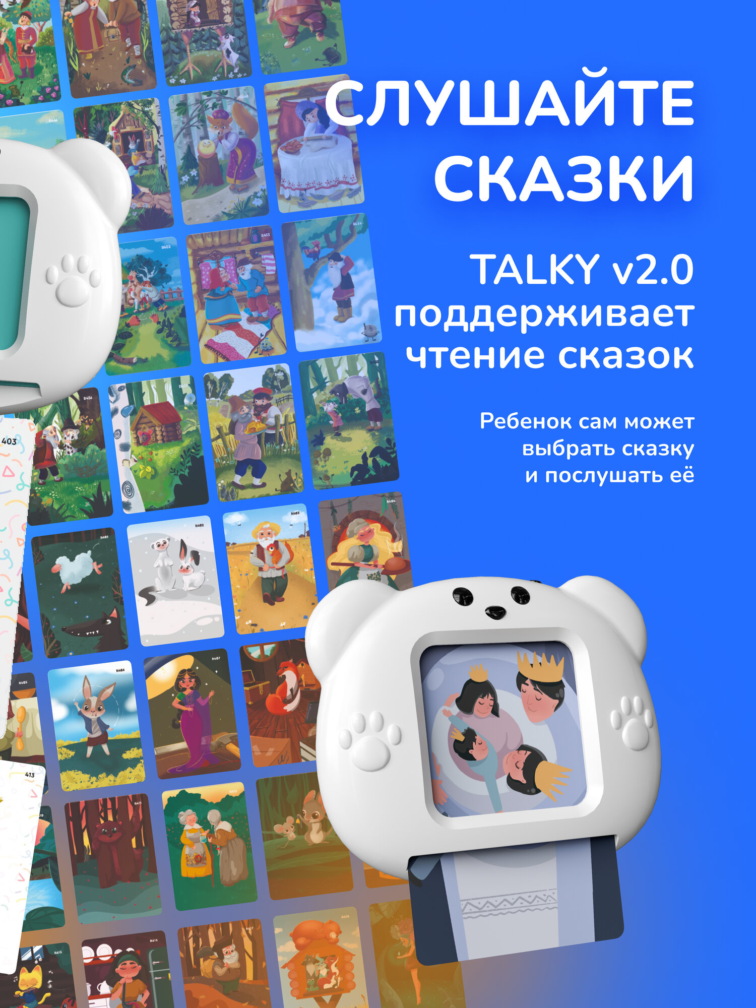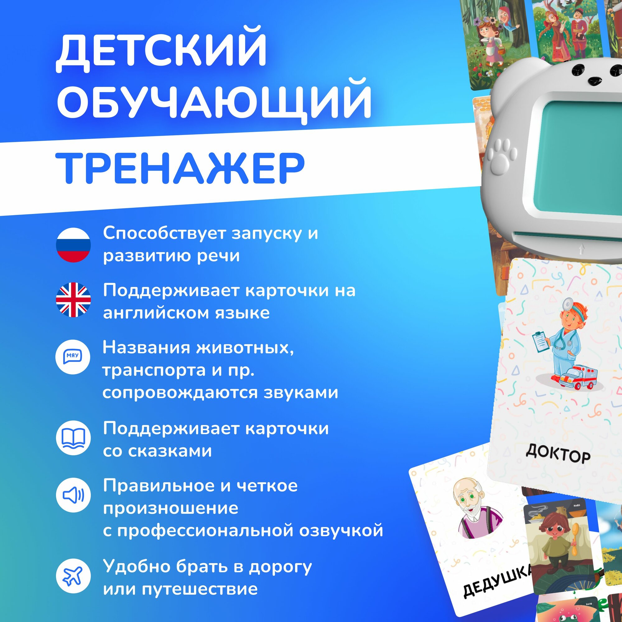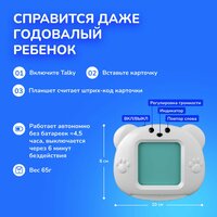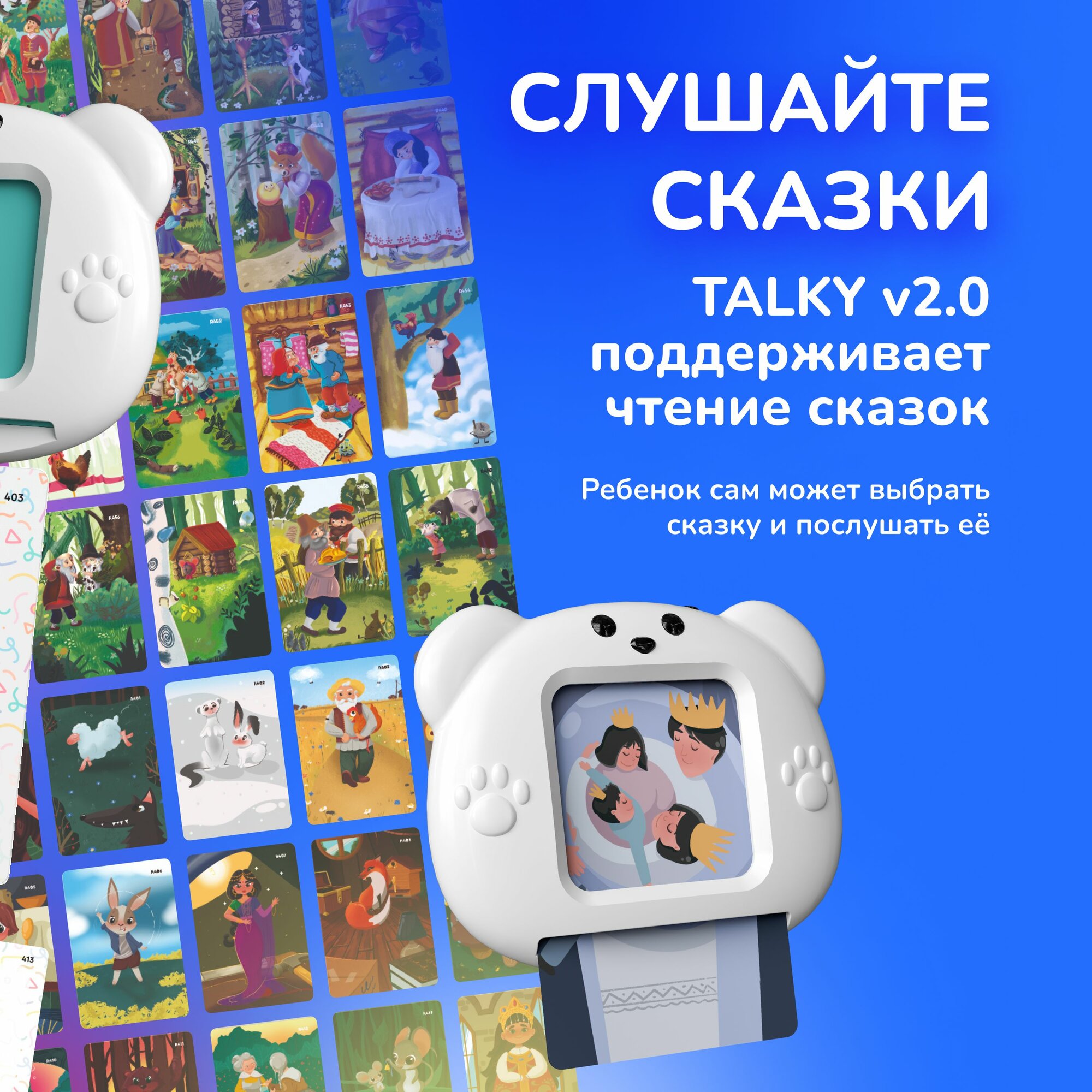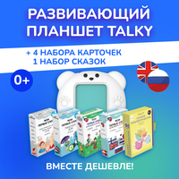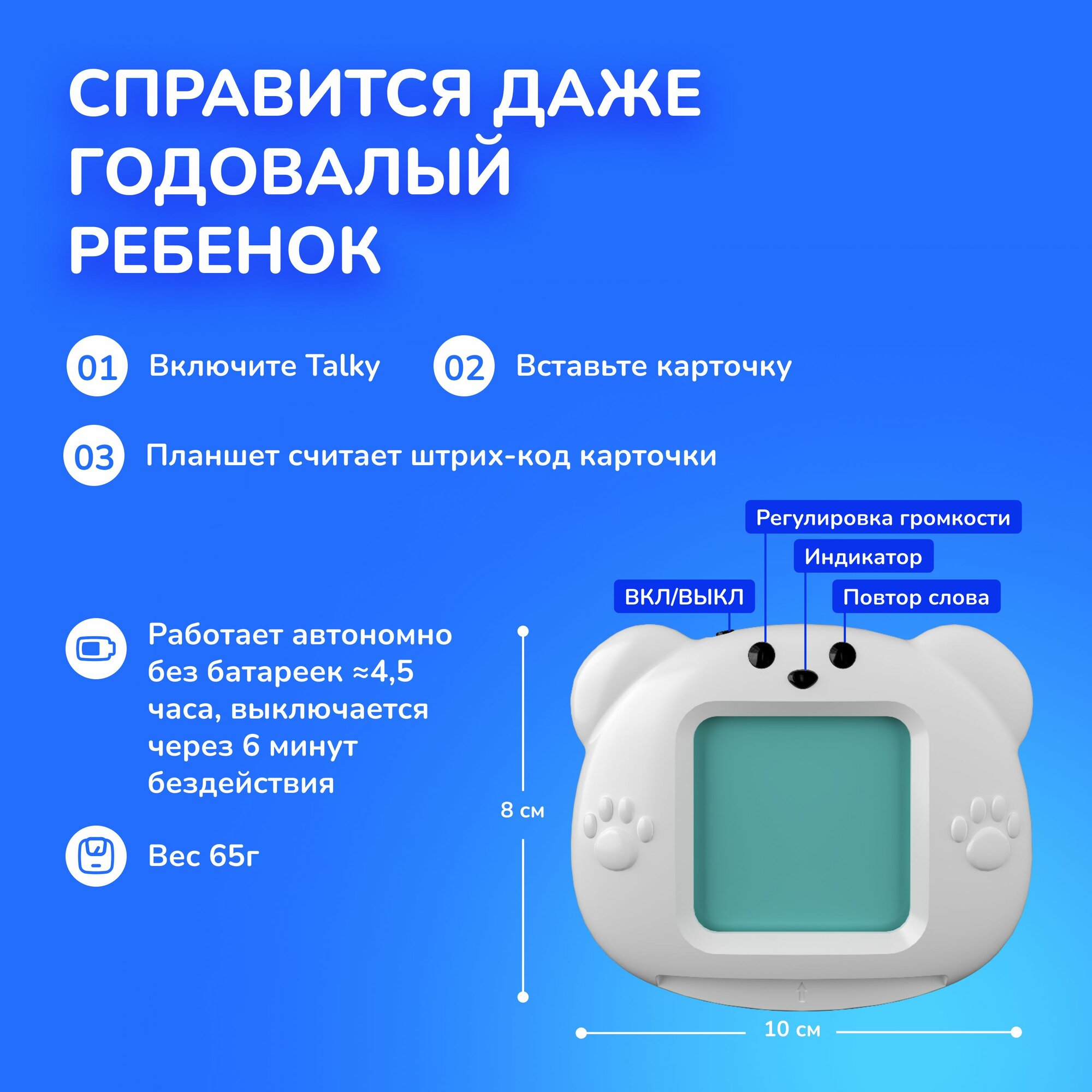 Бестселлер этого года - TALKY v.2.0. Talky поможет расширить пассивный словарный запас, развить мелкую моторику, запустить речь и весело выучить слова сразу на двух языках. Talky - вставьте умную карточку с QR-кодом на обратной стороне и устройство прочитает ее. Мы улучшили характеристики динамика, увеличили количество поддерживаемых карточек-слов и добавили возможность слушать сказки. В СЕТ входит 5 разных наборов карточек.
