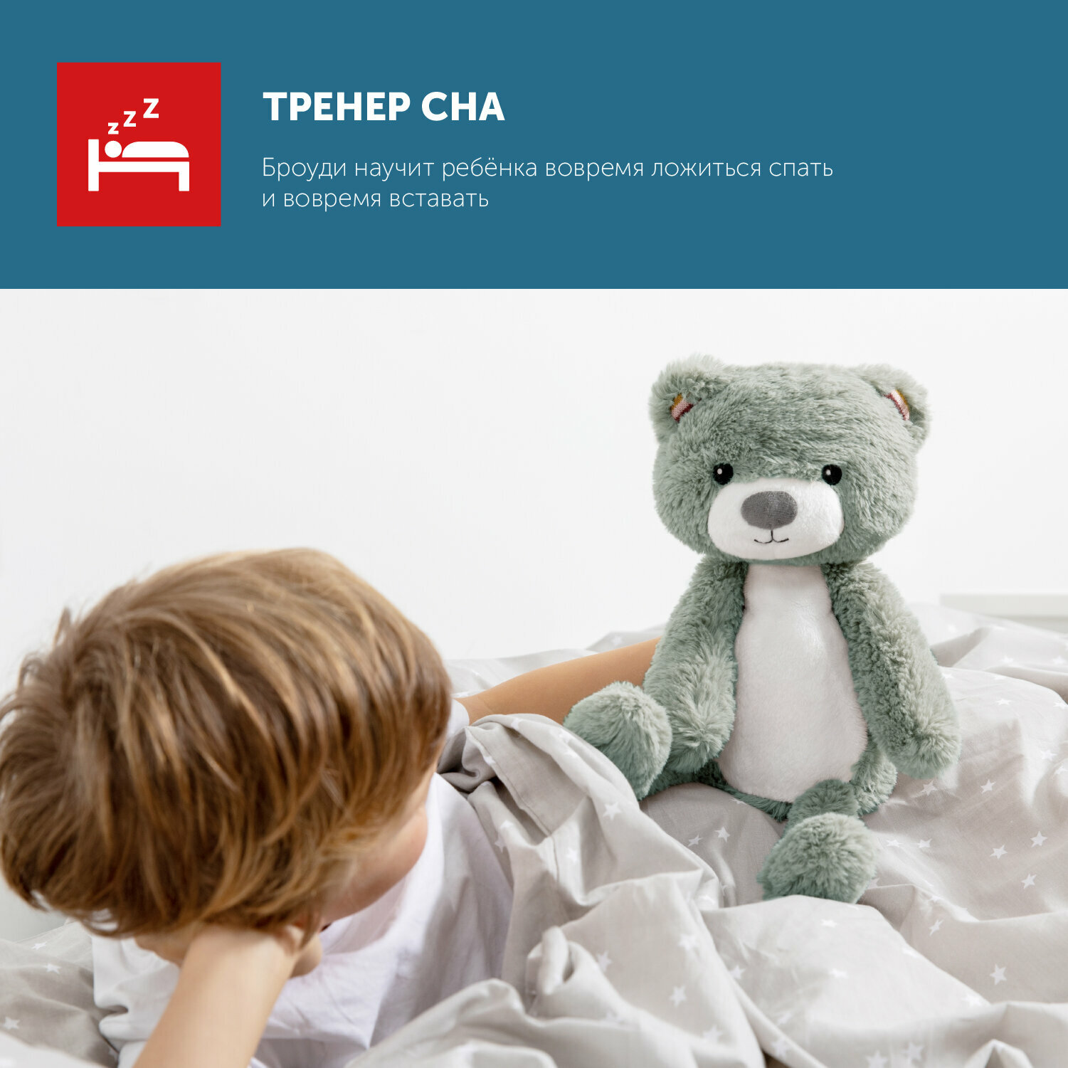 В компании с Броуди малыш обретёт чувство времени и благодаря визуальным индикаторам научится засыпать и просыпаться по расписанию. Родителям мишка станет незаменимым помощником, а детям – первым другом и преданным ночным спутником!