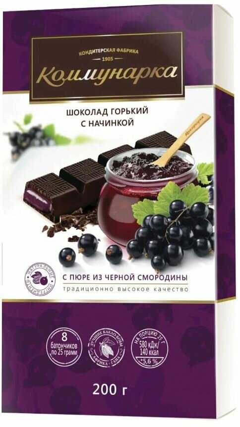 Шоколад темный с пюре из черной смородины Коммунарка 200г – натуральный темный шоколад в сочетании с начинкой из черносмородинового пюре, богатого пектином, витаминами и минеральными веществами. Начинка из пюре черной смородины с приятной кислинкой полюбилась и запомнилась многим. Шоколад состоит из 8 отдельных батончиков в удобных стиках из фольгированной бумаги. Вы сможете брать с собой столько шоколадок, сколько нужно, и делиться ими с друзьями и коллегами.