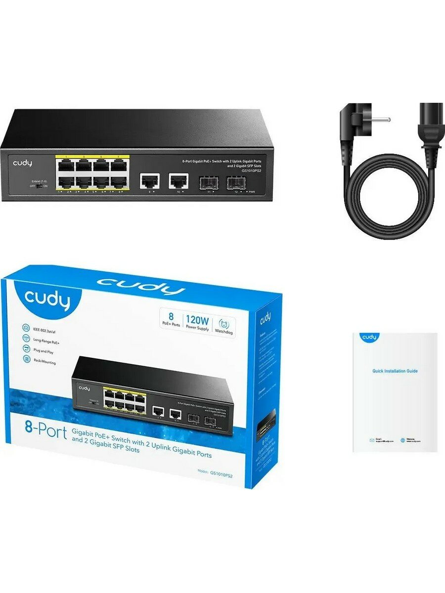 Коммутатор неуправляемый с PoE, Cudy GS1010PS2 10 портов RJ45 10/100/1000 Мбит/с, 8xPoE, 30W/port, 2×1000 BASE-X SFP (GS1010PS2): сравнение цен, характеристики, фото, актуальное наличие и цены.