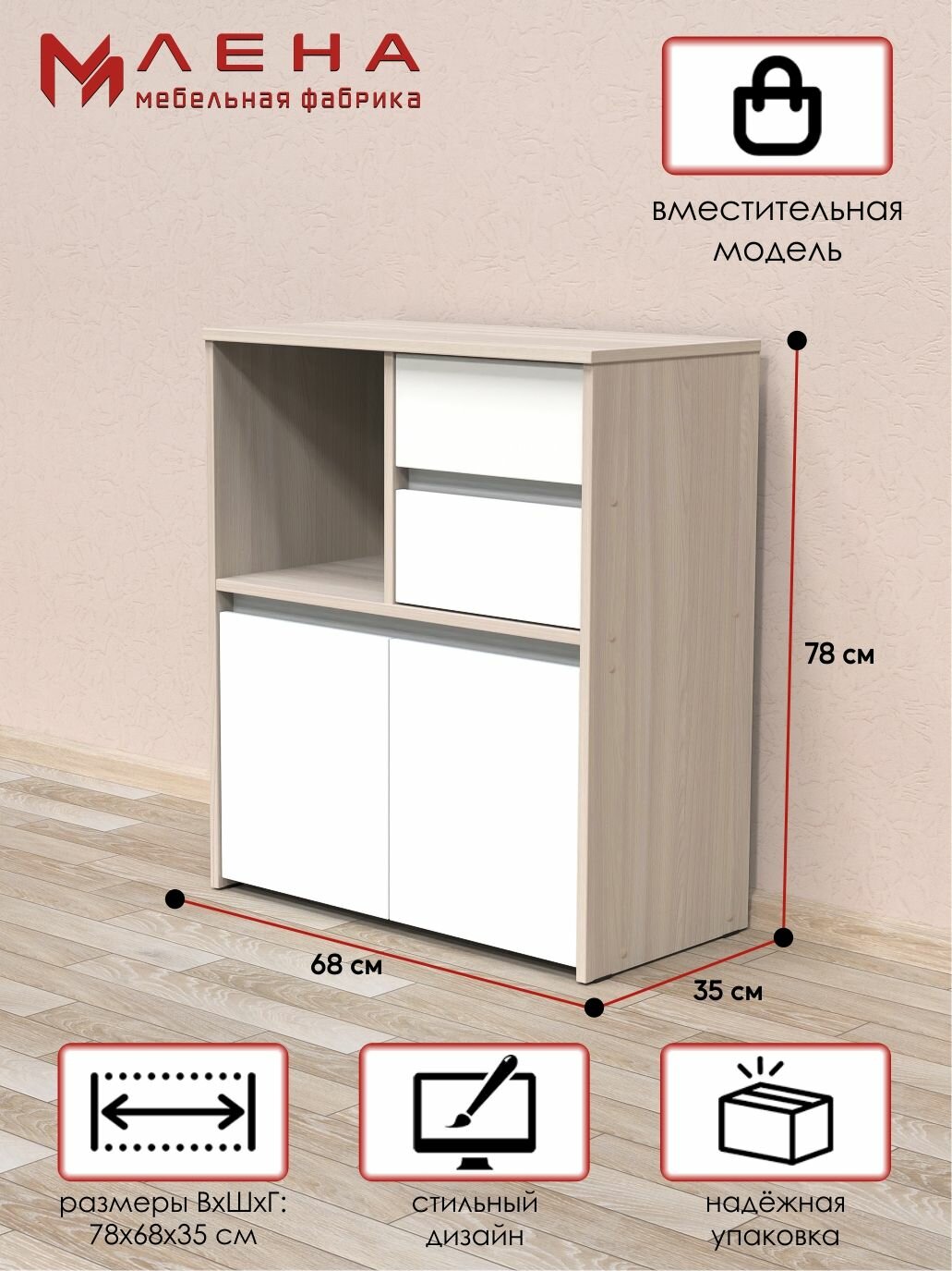 Комод деревянный для вещей №15 от Мебельная фабрики лена – идеальное решение для оснащения вашего дома. Этот классический комод изготовлен из качественного ЛДСП, что обеспечивает его долговечность и прочность. В его состав входят две секции с роликовыми направляющими, что облегчает открывание и закрывание ящиков. Комод оснащен распашными дверцами, что позволяет скрыть от глаз личные вещи. Благодаря стилю классического дизайна, этот комод будет отличным дополнением к интерьеру гостиной, дачи или прихожей. Несмотря на то, что сборка требуется, она не представляет сложности и не потребует специальных инструментов. Выбирайте Комод деревянный для вещей от Мебельной фабрики лены для создания уютного и функционального пространства в вашем доме. Изделие поставляется в разобранном виде. Хорошо упаковано в гофротару вместе с необходимой фурнитурой для сборки и подробной инструкцией. Мы как прямые производители мебели гарантируем вам высокое качество товара. Вся продукция сертифицирована. Будем вам признательны, если после покупки вы оставите нам отзыв! В случае недовложений (инструкции, фурнитуры и прочего), а также если присутствуют дефекты на деталях, свяжитесь с нами через раздел WB "Вопросы". Мы обязательно вам ответим и решим любой вопрос.