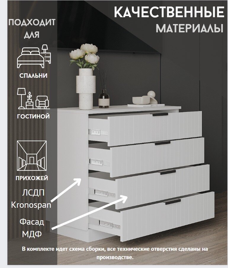 Комод Венеция белый Классический, удобный и функциональный Имеет небольшую высоту и глубину, благодаря чему займет минимум места без потери основного пространства Корпус выполнен из качественного ЛДСП, фасад из МДФ с учетом применения всех основных современных технологий обработки материалов Система хранения оборудована четырьмя выдвижными ящиками с качественными шариковыми направляющими Размер ящика позволяет разместить все необходимые вещи: текстиль, детские игрушки, аксессуары Прочная и надежная столешница комода может быть использована в качестве подставки под ТВ или другие предметы интерьера Информация о цвете товара смотрите в карточке товар с указанием артикула цвета Характеристики: Форма поставки: в разобранном виде Материал: корпус-ЛДСП, фасад-МДФ Размеры Ш75,2/Г38/В83 Вес упаковки: 25 кг Модель икеа Особенность: простота сборки, инструкция по сборке и все необходимые комплектующие в наличии Сертификат качества продукции Производство Россия.