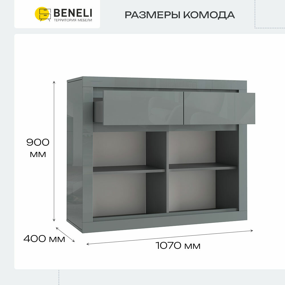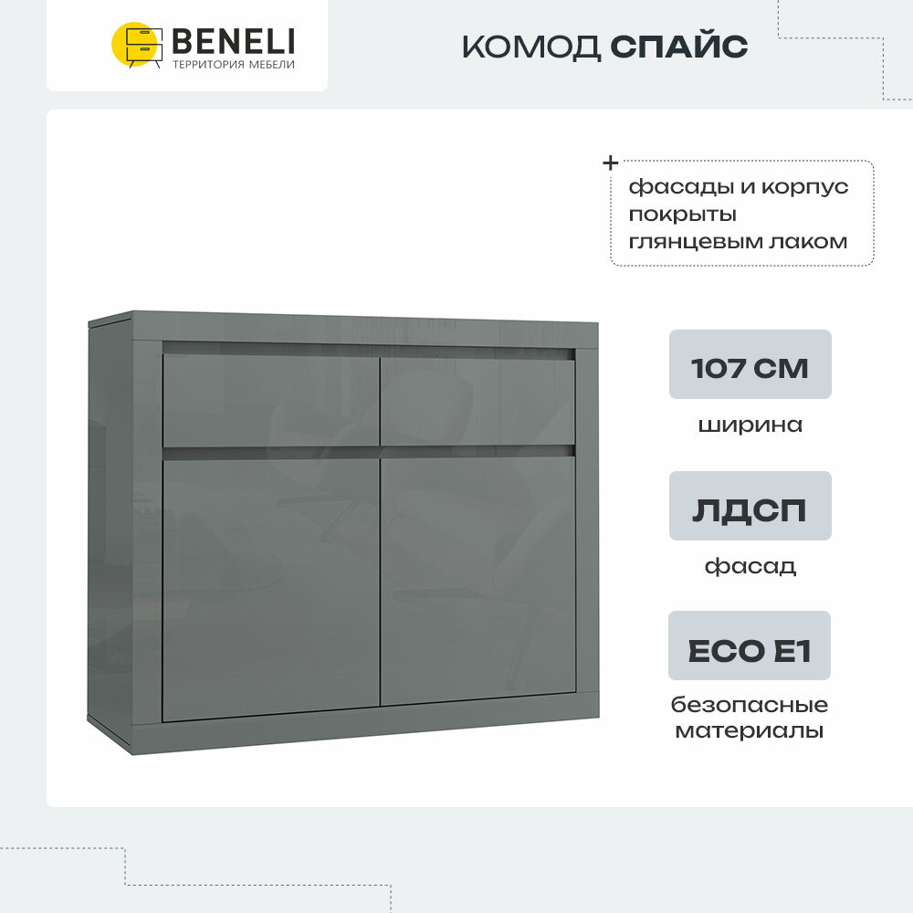 Комод Beneli Спайс 2 ящик Серый глянец, 107х40х90 см - это лучшее решение для оптимизации пространства квартиры или дома. Однако не стоит воспринимать комод в гостиную только как функциональный предмет для хранения вещей. Комод большой отлично впишется в декор помещения в стилях минимализм, классический, лофт, модерн или хай-тек. В гостиной комод большой для вещей выполняет функцию ТВ-тумбы или книжной полки. Разместив на длинном комоде пеленальную доску, получится отличный пеленальный комод для новорожденных. Комод для одежды может совмещать функции нескольких предметов мебели: комод для спальни или комод в детскую. Например, комод в спальню легко заменит рабочий шкаф и место для хранения вещей, а комод с зеркалом станет достойной заменой туалетному столику. Поставьте камод для одежды вместе с письменным столом и он станет помощником в хранении учебников, тетрадей и канцелярии, игрушек. А поставив комод в прихожую, будет сочетаться с обувницей. Также на Ваш выбор комоды с ручками и без. Тумба для кухни имеет выдвижные ящики для хранения вещей. Комод узкий, но тем не менее достаточно вместительный. При изготовлении комода в кухню используются сертифицированные, высококачественные ЛДСП и мебельная фурнитура, поэтому он прослужит Вам не один год. Обратите внимание, комод широкий придет вам в разборном виде. Установка мини комода очень проста: инструкция по установке и ключ шестигранник идет в комплекте. Комод «спайс» - идеальный выбор для вашего интерьера! Комод - это идеальное решение для хранения одежды и других вещей. Он является незаменимым элементом интерьера, который поможет организовать пространство и создать уют в вашем доме. Представляем вам комод “спайс”, который выполнен из высококачественного ЛДСП класса Е1, что гарантирует безопасность и экологичность материала. Каркас и фасады комода облицованы глянцевым лаковым покрытием, которое придает изделию изысканный и стильный вид. Внутри каждого ящика установлены шариковые направляющие, обеспечивающие плавное и бесшумное открытие и закрытие. Это особенно важно, если у вас есть маленькие дети или домашние животные. Комод для одежды “спайс” - это не только функциональный элемент интерьера, но и украшение вашего дома. Он станет прекрасным дополнением к любому дизайну и позволит организовать хранение вещей максимально комфортно и аккуратно. Не упустите возможность приобрести этот стильный и практичный комод. Сделайте свой дом еще уютнее и комфортнее с помощью комода “спайс”! икеа, ikea, икея, моби, letta, garun, хофф, hoff, A-A MEBEL, Puzzlemebel, ДСВ Мебель, гудд лакк, нонтон, трия