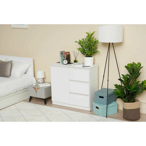 Комод Челси 800 (3 ящика+1 дверь) Белый глянец холодный/Белый – идеальное решение для вашего интерьера. Этот стильный комод выполнен в белом глянцевом цвете, который придаст вашим комнатам светлоты и элегантности. Он прекрасно впишется в спальню, гостиную или детскую комнату, обеспечивая удобное и практичное хранение личных вещей.